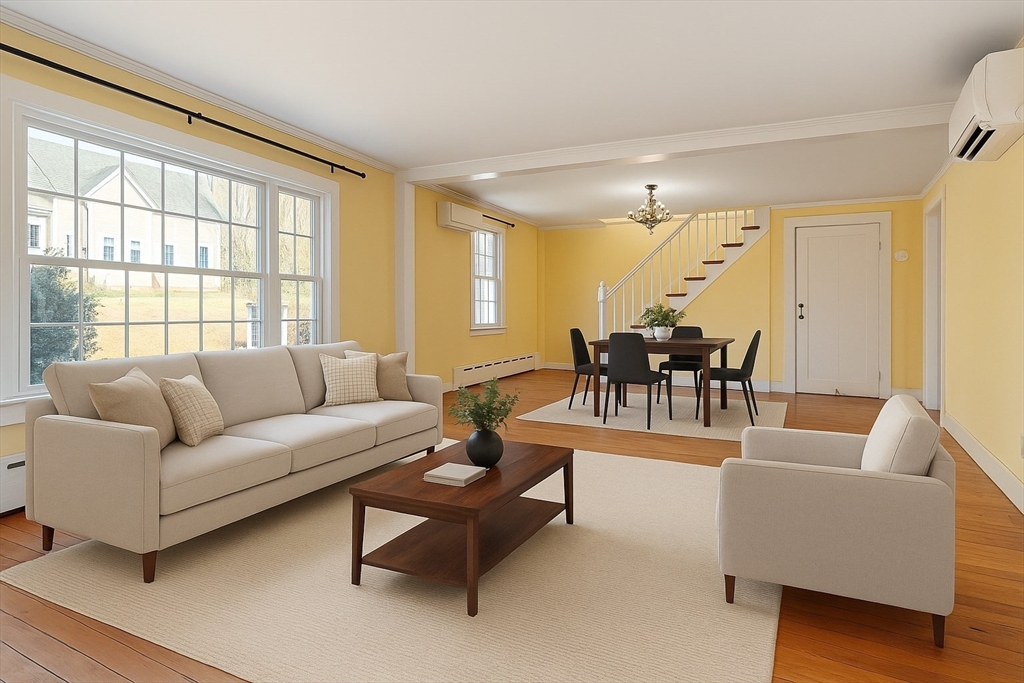 Welcome to this charming Cape set on 1.4 acres with blueberries, established perennials, mature shrubs, and a peaceful wooded backdrop. Located in a wonderful neighborhood near Marshall Park, this home blends the warmth of its historic character with thoughtful updates.The main level features hardwood flooring, a living/dining room with a Heat’n’Glo gas fireplace, and a bright eat-in country kitchen with a bay window overlooking the backyard. The first-floor primary bedroom includes an adjoining bonus room that could function as a changing room, nursery, or cozy sitting area. A flexible additional room on the first floor is ideal for a home office.Upstairs are two bedrooms with built-in cabinetry. Enjoy quiet evenings on the screened porch, perfect for relaxing or entertaining. A barn provides excellent storage or hobby space. Major improvements include a new septic system (2014) and updated kitchen counters and cabinetry. A full basement offers additional storage. Conveniently located