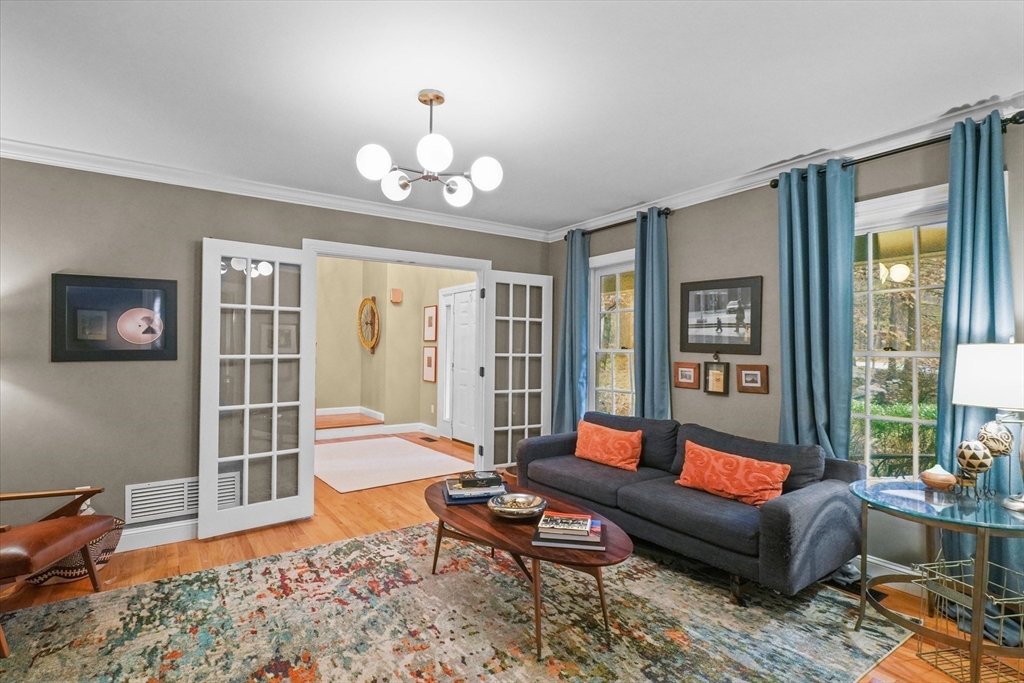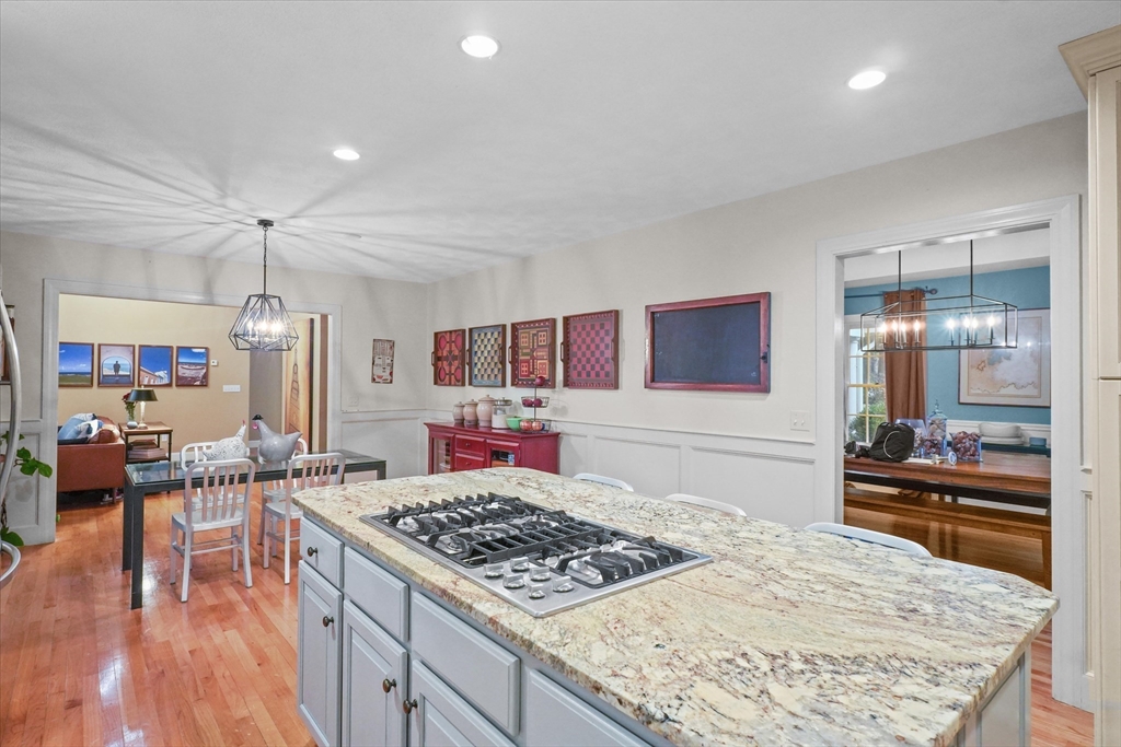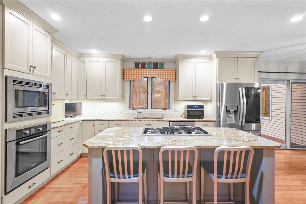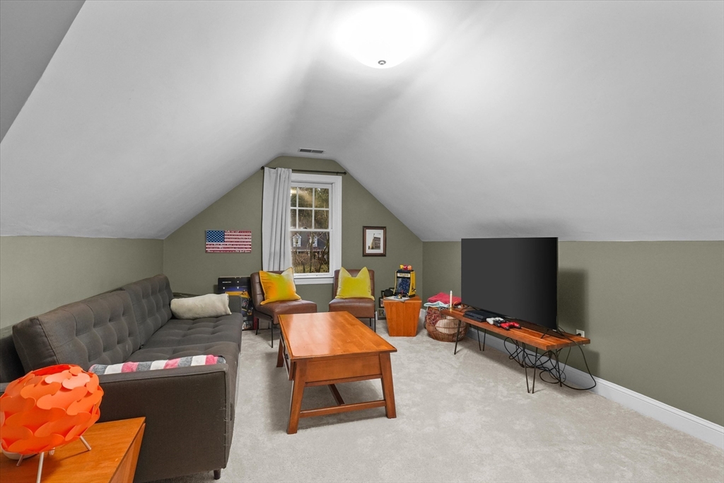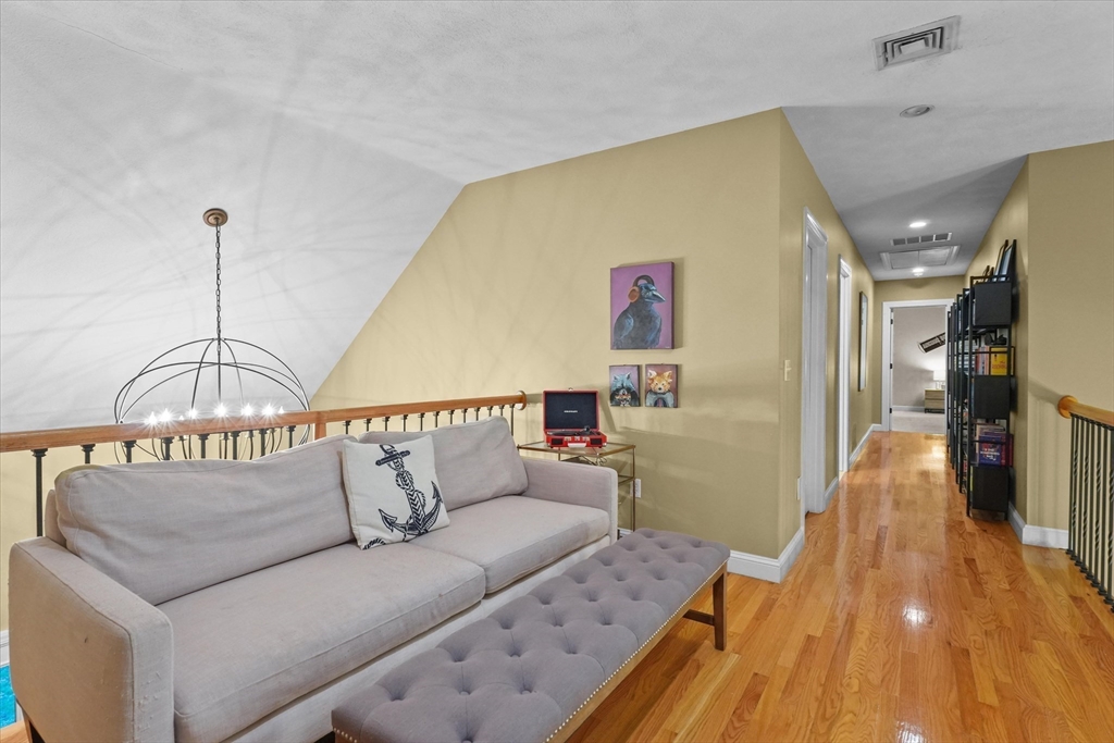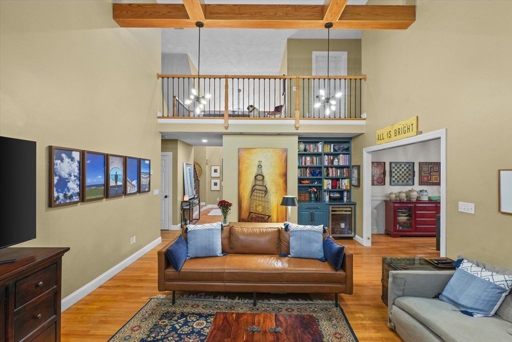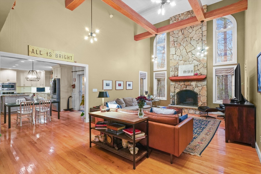 Located in a highly desirable E. Boxford cul-de-sac neighborhood, this 4BR, 2.5BA Cape offers 4,174 sq ft of beautifully designed living space on 2 private acres. A dramatic two-story foyer with cathedral ceiling and large closet leads to the open floor plan featuring an eat-in kitchen with granite counters, center island & stainless appliances. The stunning family room showcases a vaulted, beamed ceiling, indoor balcony overlook & floor-to-ceiling stone fireplace that anchors the space. Enjoy the first-floor primary bedroom with 2 walk-in closets. The exceptional lower level includes custom woodwork, a media area, game room & access to outdoor spaces. Enjoy a composite deck off the kitchen plus a covered lower-level patio ideal for year-round relaxation and entertaining. Updates include remodeled bathrooms (2020), stunning overhead lighting, roof (2019), HVAC (2023) & whole-house generator. Built in 1997 and meticulously maintained, this home blends comfort, style, and generous space.