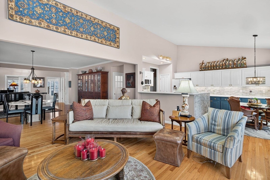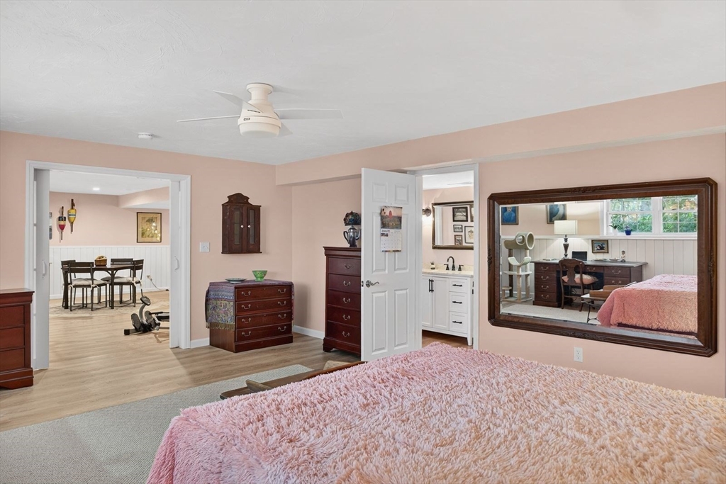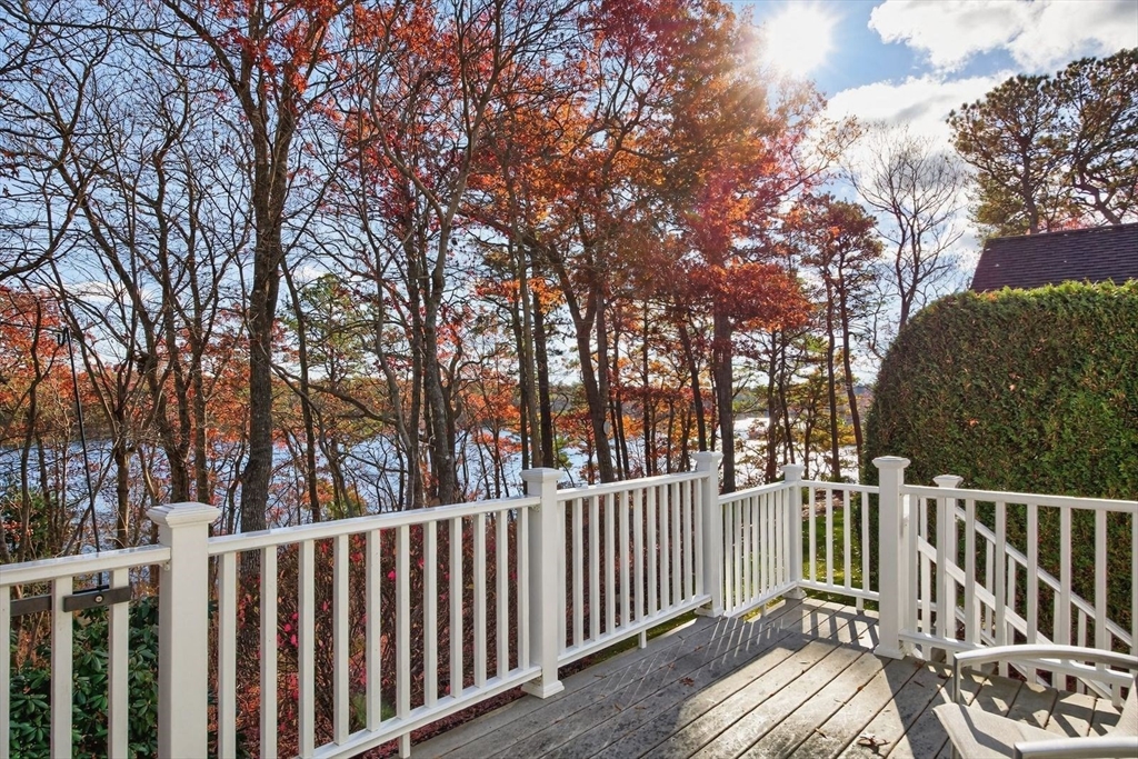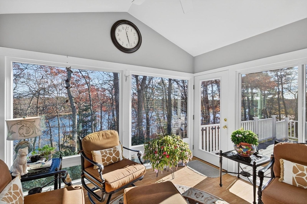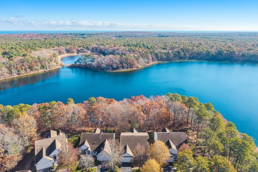 Lovely "Vanderbilt" home on a pond view homesite in the 55+ Great Island Neighborhood in The Pinehills. This popular style home has an office at the entry. The expanded and remodeled dining room and living room with fireplace has a great open feel with a sunroom off the kitchen. The kitchen has extended cabinets and a beautiful backsplash, a true kitchen delight. The primary bedroom has a remodeled bathroom with new tiled shower. There is a guest bedroom and full bath plus a laundry room also on the first floor. A three-season room with a deck overlooks the pond and yard. The lower level was custom finished and has an expansive living room with kitchenette and an additional bedroom with full bath and tiled shower, many closets and storage areas. The HOA amenities include an indoor pool and outdoor pool, tennis courts, pickle ball courts, an activity director, game rooms, function rooms and exercise rooms. Snow removal, lawn mowing and trash removal. What a wonderful way to live!
