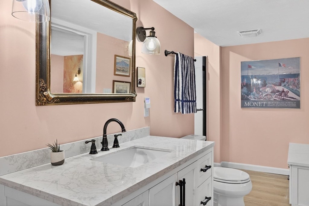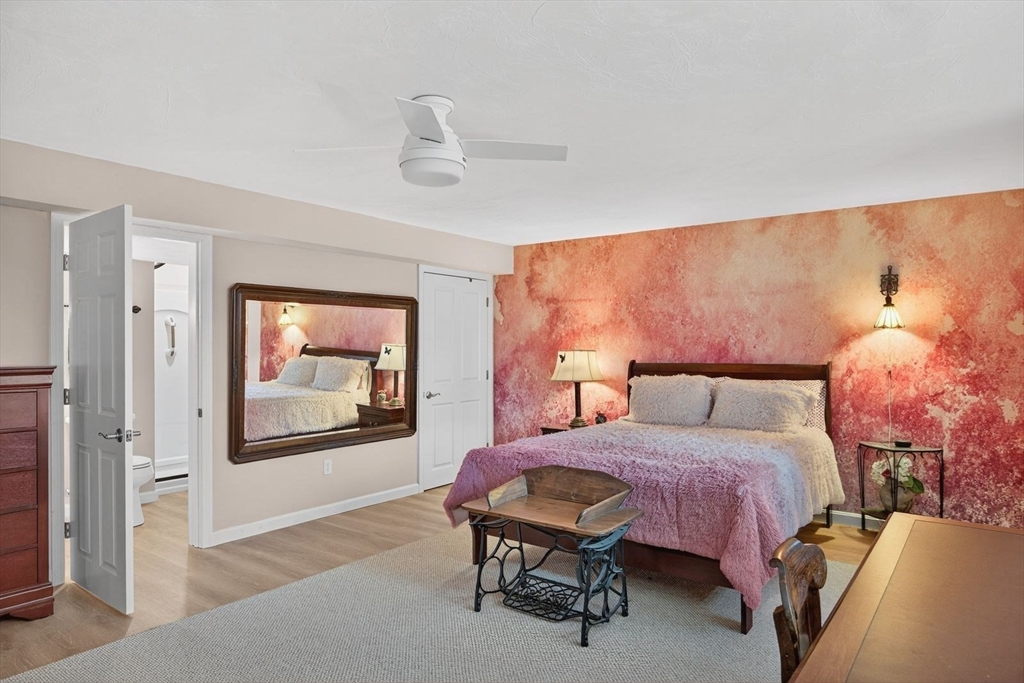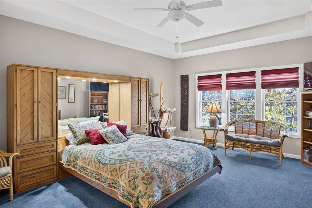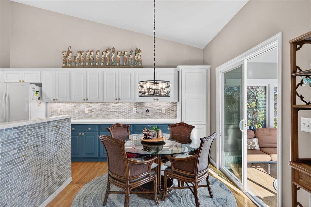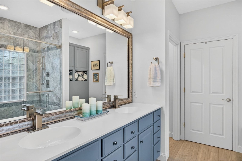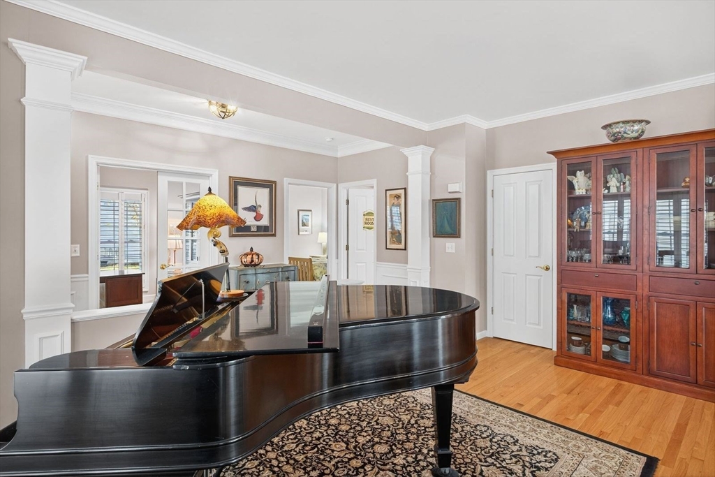 Lovely "Vanderbilt" home on a pond view homesite in the 55+ Great Island Neighborhood in The Pinehills. This popular style home has an office at the entry. The expanded and remodeled dining room and living room with fireplace has a great open feel with a sunroom off the kitchen. The kitchen has extended cabinets and a beautiful backsplash, a true kitchen delight. The primary bedroom has a remodeled bathroom with new tiled shower. There is a guest bedroom and full bath plus a laundry room also on the first floor. A three-season room with a deck overlooks the pond and yard. The lower level was custom finished and has an expansive living room with kitchenette and an additional bedroom with full bath and tiled shower, many closets and storage areas. The HOA amenities include an indoor pool and outdoor pool, tennis courts, pickle ball courts, an activity director, game rooms, function rooms and exercise rooms. Snow removal, lawn mowing and trash removal. What a wonderful way to live!