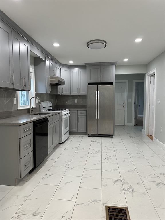 Stunning complete new renovated single family with 4 beds and two full baths located on the desirable Wollaston location in Quincy, only a few blocks to Wollaston MBTA "red-line T" station This beautiful apartment features a welcoming enclosed porch, a bright living room, eat-in kitchen with quartz counter top and back-splashed, recess lighting, two bedrooms and a full bath with a shower stall complete the main level. 2nd floor offers a full bath with a shower stall, two good-sized bedrooms with the main bedroom has a private balcony. Brand new gleaming hardwood floor. Freshly painted. Gas heat and cooking. Central air. Washer and dryer are available in the basement. Off-street parking for 2 vehicles. Tenants pay for ALL utilities including the water bill. 1st month and full month of security deposit are required. Per the landlord, no pets are allowed. Excellent credit/income/references are required. Available immediately.