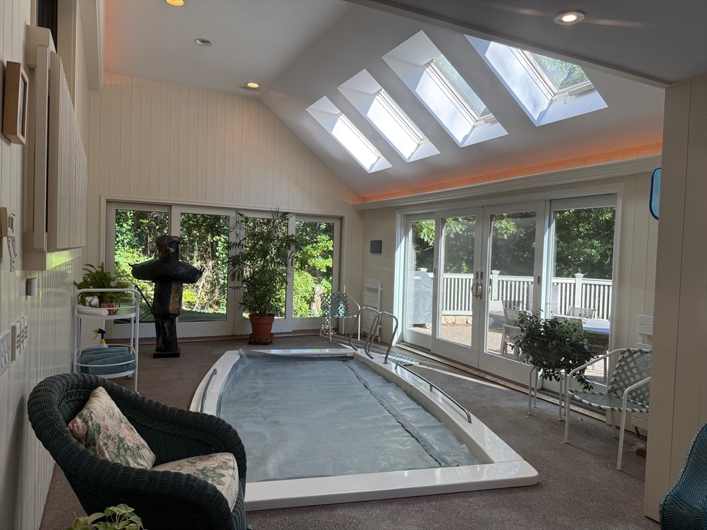 Exquisite Contemporary, tucked in on 1.91 gorgeous acres offering privacy! A timeless retreat providing easy & comfortable living spaces for kick back weekend gatherings & entertaining. There is room for all within 4 bedrooms, 4 baths, a living room with a wood burning fireplace, an indoor therapeutic pool for conditioning & staying fit, a terrace with a retractable awning to keep the sun or rain at bay, no matter what the weather, for alfresco dining, a classic handrail rar,p for easy access & entrance to house amongst lovely gardens where form & function coexist with nature. Easy commute to Boston, nearby Sandy Neck beaches & all the best Cape Cod has to offer! Park the car & unpack your bags, you've found your Cape retreat! Buyers & Buyer's Agents to confirm all information contained within.