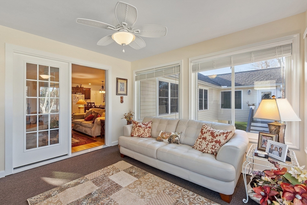 Start the New Year in your new home! This single owner, meticulous home is move-in ready ... the open floor plan includes 8' ceilings perfect for entertaining and relaxing! Sparkling hardwood flooring throughout the kitchen, dining area and living room with access to both walk-up attic, huge unfinished basement and laundry closet. Kitchen has beautiful hardwood cabinets and granite countertops including a large center island with bar stools and an attached dining area, leading into living room and 12 x 12 three season porch. The Primary bedroom offers two spacious closets, a large bathroom with walk-in shower and wall-to-wall carpeting. The second bedroom is perfect for guests or to use as a den with a large closet and natural light. Located at the rear of the development, your patio and small deck overlooks a wooded area.Storage within this unit is abundant! Conveniently located near shopping, highways, and much more.
