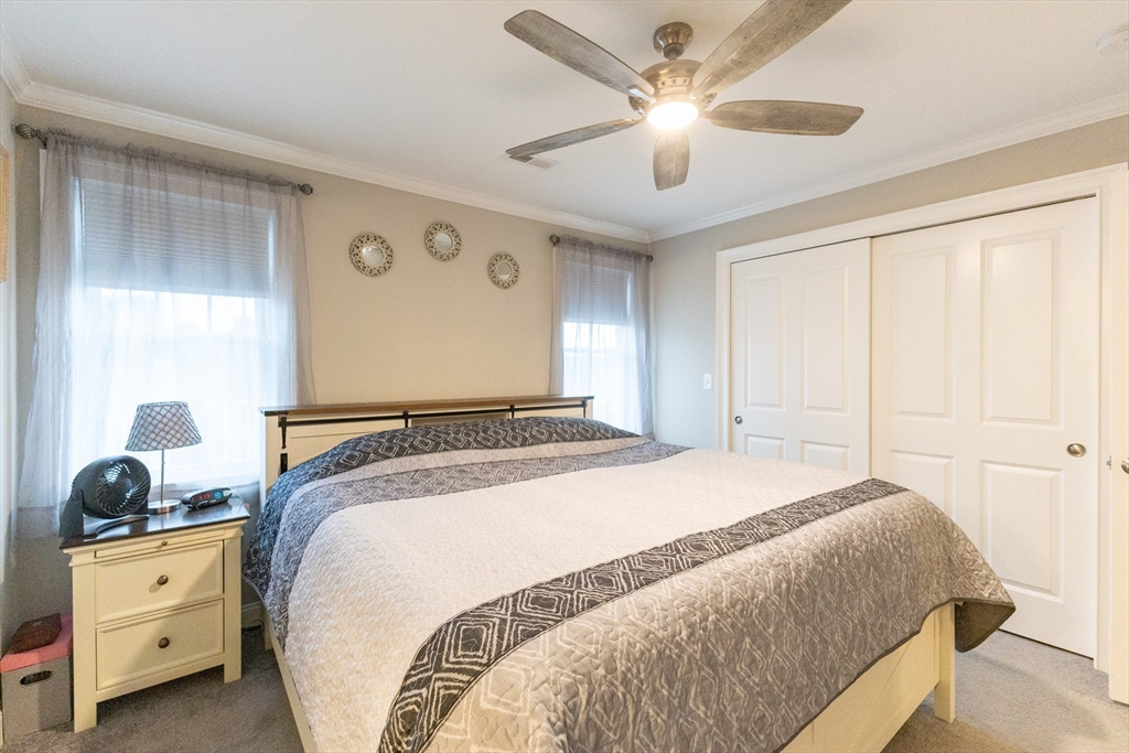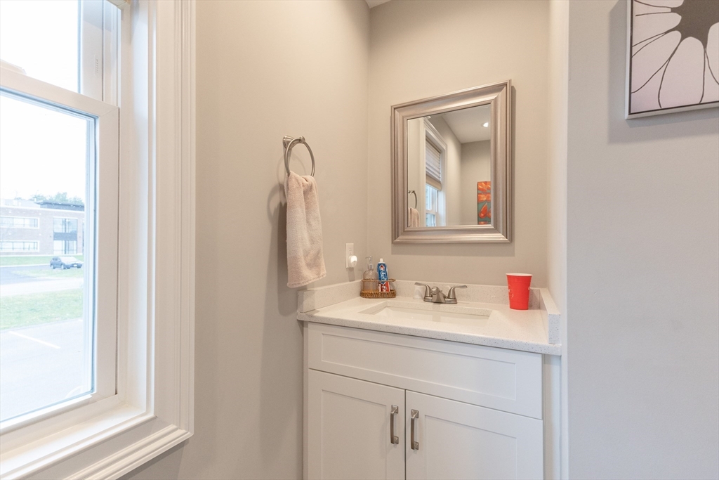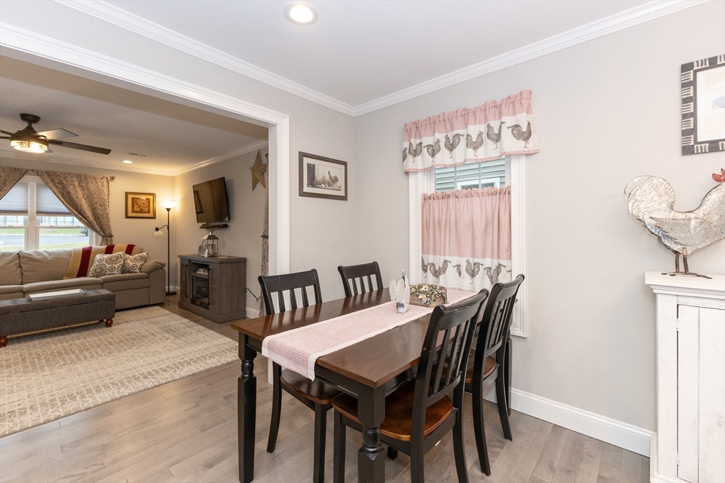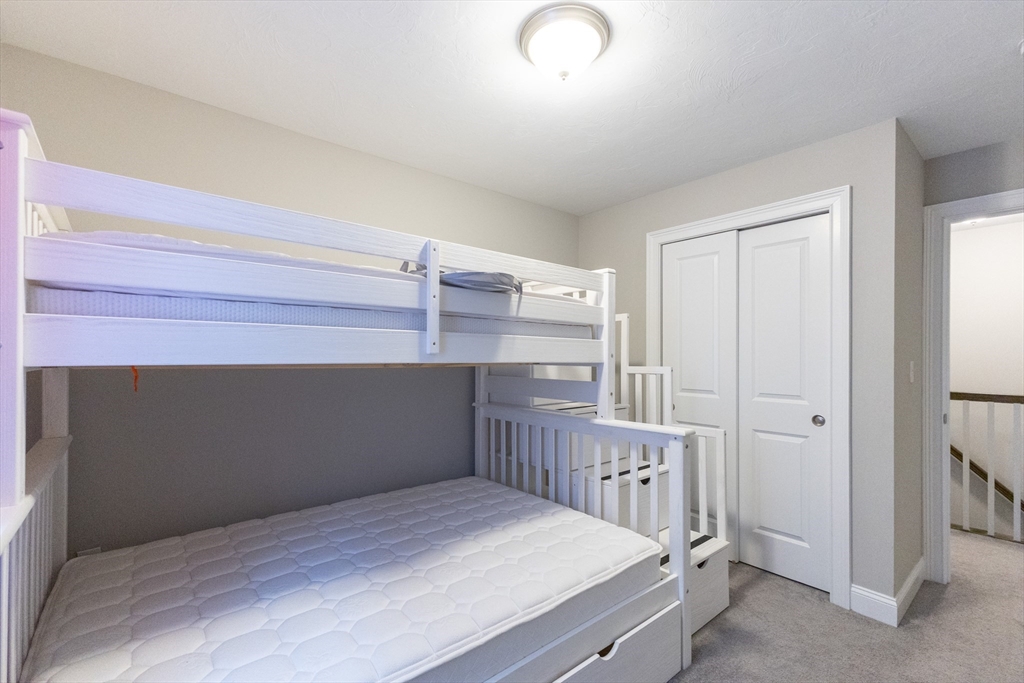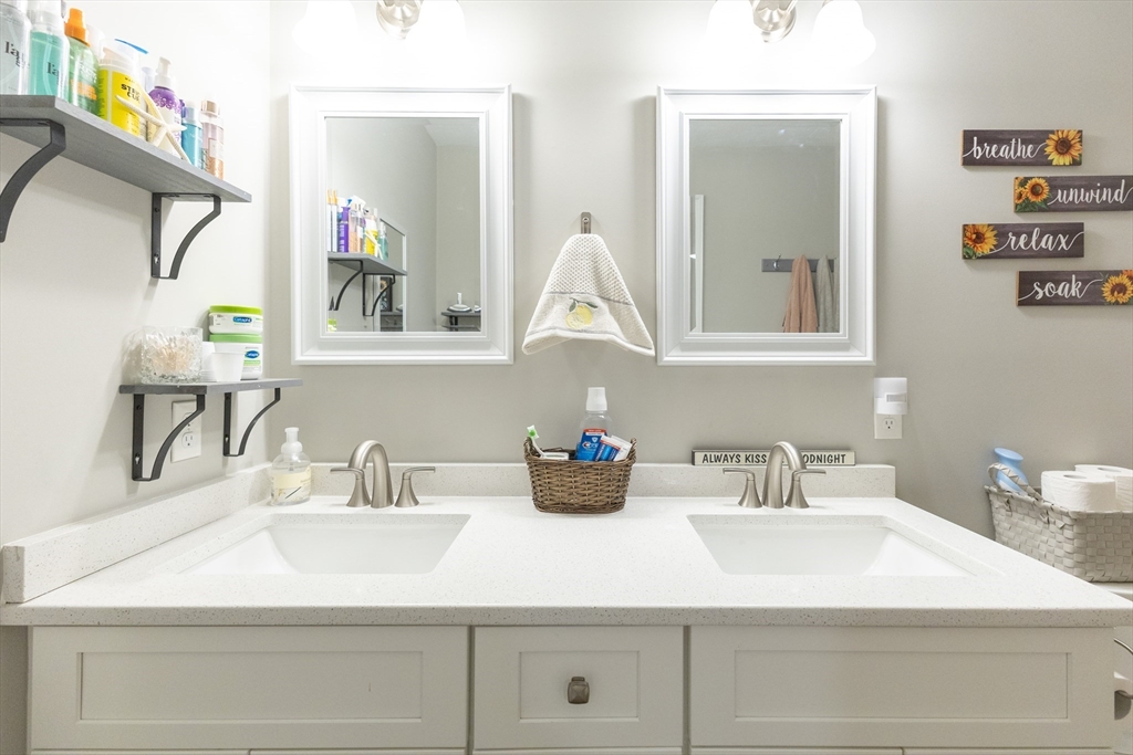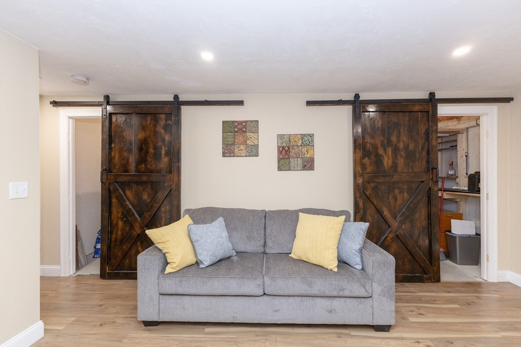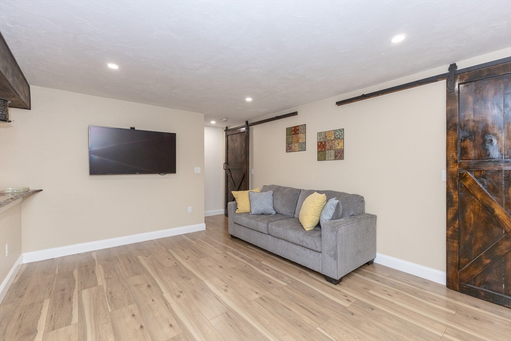 Welcome to 39 Riverside Drive, a beautifully updated Lakeville duplex that blends modern comfort with magazine worthy charm. The main level features a stylish kitchen with stone counters, an island for casual dining, stainless appliances, and white cabinetry, opening to a warm dining area and a bright living room with hardwood flooring. Upstairs, the primary suite offers its own full bath and soft wall to wall carpet, while two additional bedrooms provide great flexibility. The finished lower level adds a spacious family room with vinyl flooring perfect for movie nights, hobbies, or extra living space. Enjoy the convenience of central air, heat pump heating, town water, and private sewer, plus two dedicated parking spaces. With landscaping, snow removal, and refuse removal included, this home offers an easy, low maintenance lifestyle in a quiet location close to local shops, schools, and commuter routes.