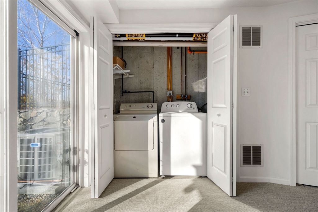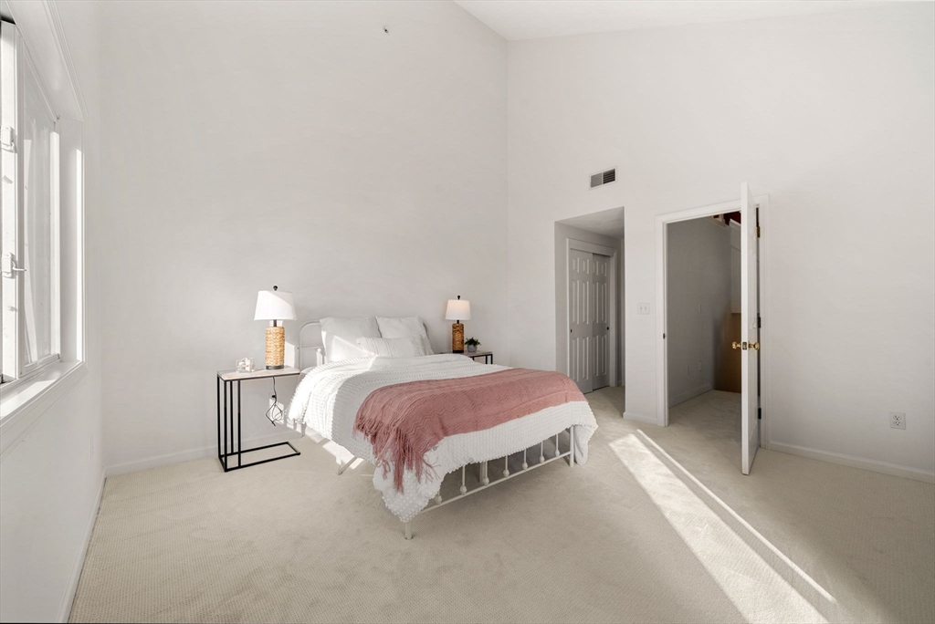 This bright, spacious townhome lives like a single-family home. Perched above the treeline, it offers abundant natural light and an open floor plan with 2 bedrooms and 2.5 baths. Enter through a dramatic two-story foyer, or through the garage into a versatile den/laundry/mudroom. The large kitchen flows to a dining area and living room with a gas fireplace and half bath. Step onto the deck that feels like a private treehouse overlooking a large yard and patio. Upstairs, the primary suite features cathedral ceilings, skylight, gas fireplace, two closets, and a spa-style bath with Jacuzzi tub. A generous guest bedroom with ensuite bath and additional loft office with skylight makes working from home easy. Recent updates include a new heating system, dishwasher, garbage disposal, and microwave. Conveniently located near Route 107, shopping, restaurants, public transportation, and a local gym. 84 Cavendish is the ideal blend of comfort, privacy, and accessibility.
