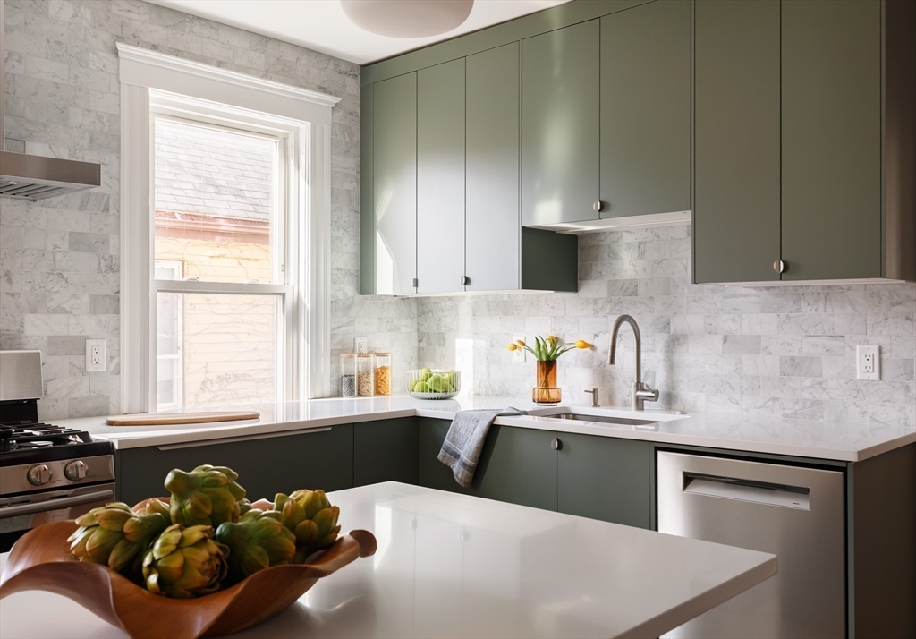 Bright and sunny 2BR apartment available for immediate occupancy. Recently updated kitchen complete with grey/green cabinets, white quartz countertops, marble tile backsplash, and stainless steel appliances. South facing windows flood in light, a pantry with laundry adjacent to the kitchen and a door ] to a private porch make summer dining easy. Spacious living and dining rooms with bay windows and period details; a china hutch and stained glass window. The updated bathroom is replete with marble tile floor, oversized vanity with mirror recessed medicine cabinet, soaking tub and white subway tile. Two bedroom with closet / space for a desk. 0.7 mi to the Porter Sq and 1.1 mi to Harvard Sq.