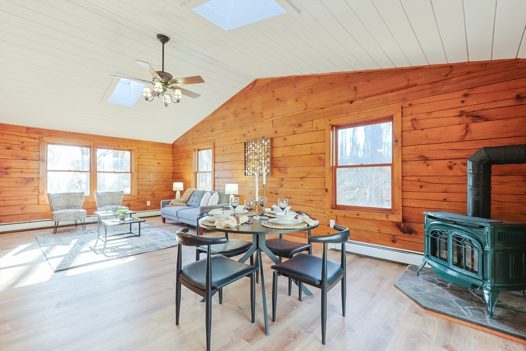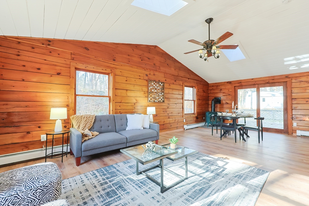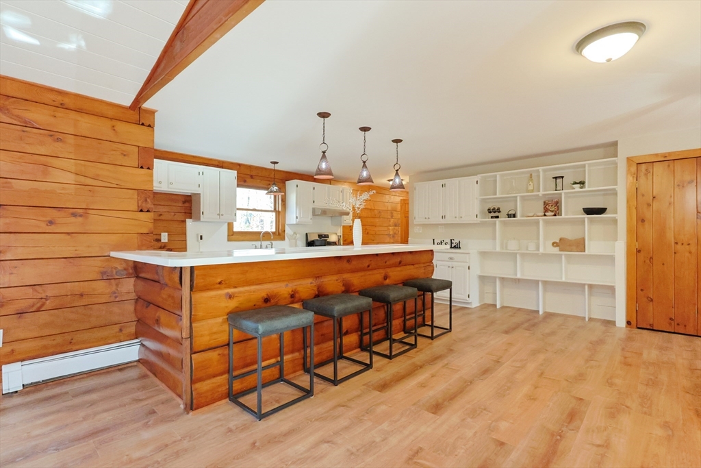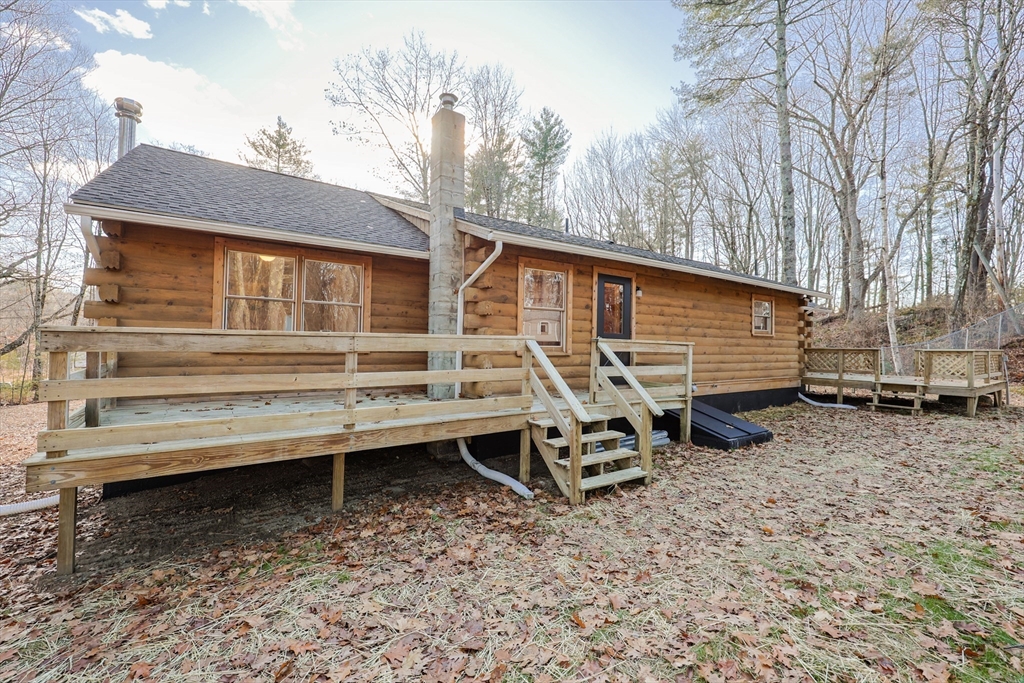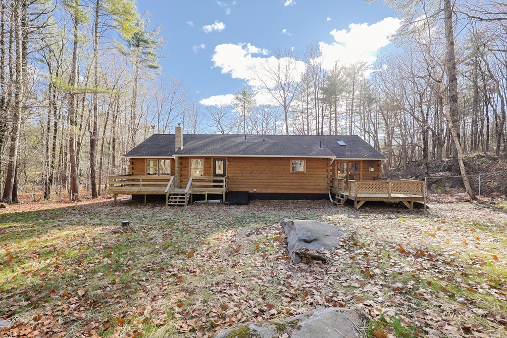 Longing for a log home? This woodland wonder offers it all - serenity, convenient upgrades, and a thoughtful layout. Settled back from the road, enjoy coffee on the porch overlooking the oversized front yard. Entering the home you'll find a guest bedroom to your left; to the right, the spacious primary suite with private bath. There is new vinyl floor and carpet throughout the home. Wood-worked walls and forest themed lighting fixtures capture the cabin-like charm. Kitchen appliances are brand new, with custom shelving. The living/ dining room feels large and bright with open floor plan and skylights. Concluding the main level is another massive bedroom and half bath. The basement features a playroom, office, and game room - perfect for studying or poker nights. The laundry room also contains washer/dryer hook up, full sink and cabinets for easy clean up. Clean utility room with oil tank, boiler, & filtration system. A brand new septic brings peace of mind. Ready to be called home!
