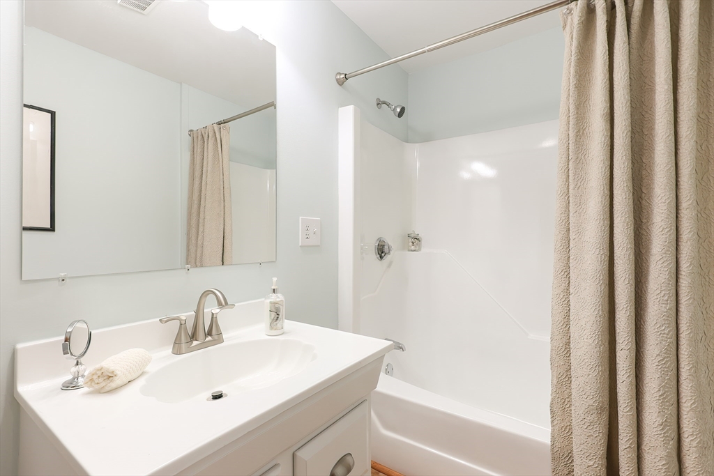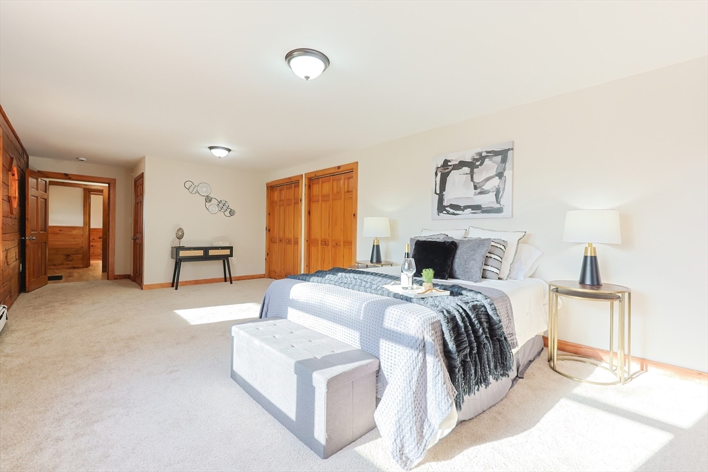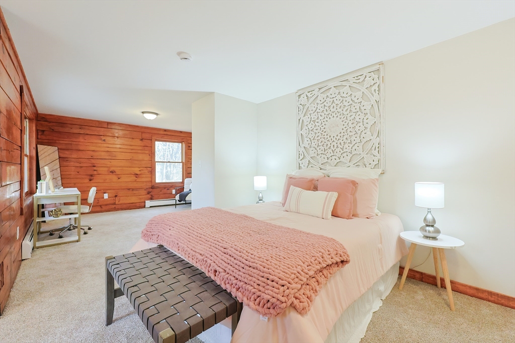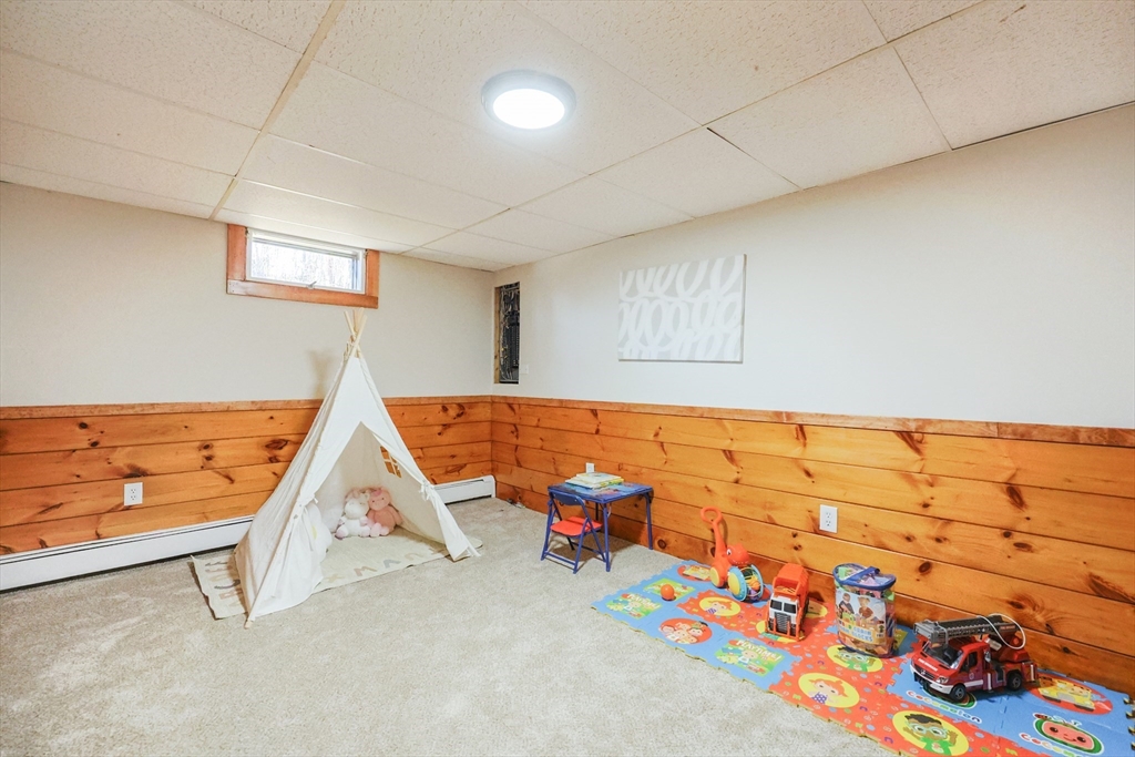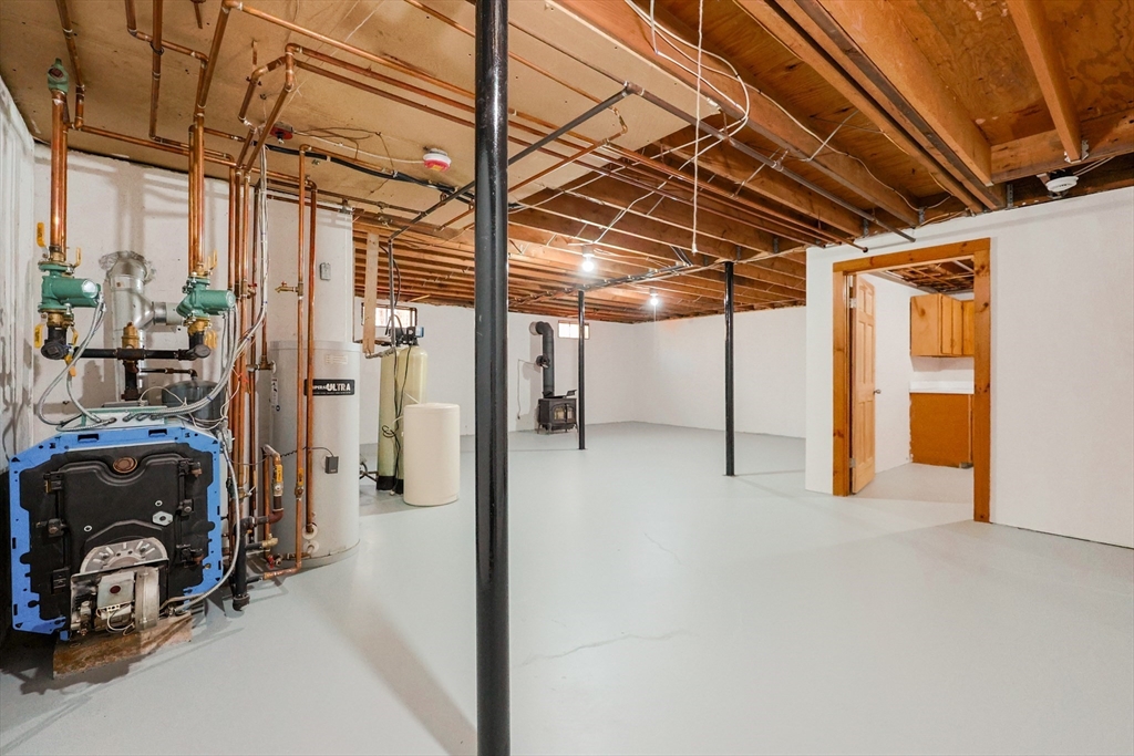 Longing for a log home? This woodland wonder offers it all - serenity, convenient upgrades, and a thoughtful layout. Settled back from the road, enjoy coffee on the porch overlooking the oversized front yard. Entering the home you'll find a guest bedroom to your left; to the right, the spacious primary suite with private bath. There is new vinyl floor and carpet throughout the home. Wood-worked walls and forest themed lighting fixtures capture the cabin-like charm. Kitchen appliances are brand new, with custom shelving. The living/ dining room feels large and bright with open floor plan and skylights. Concluding the main level is another massive bedroom and half bath. The basement features a playroom, office, and game room - perfect for studying or poker nights. The laundry room also contains washer/dryer hook up, full sink and cabinets for easy clean up. Clean utility room with oil tank, boiler, & filtration system. A brand new septic brings peace of mind. Ready to be called home!