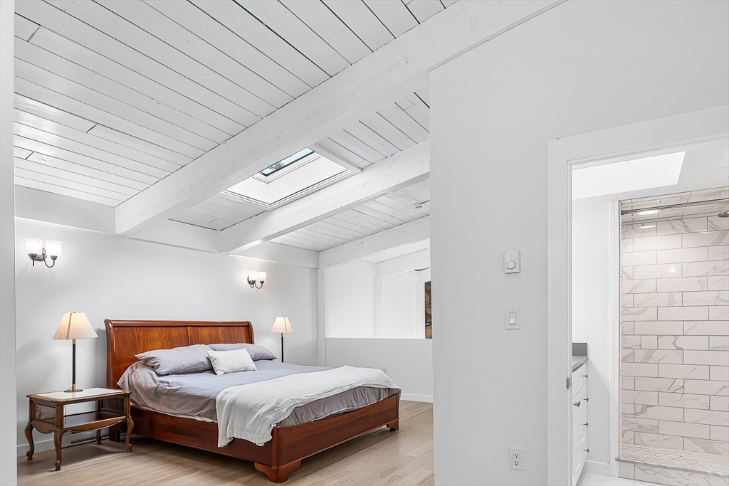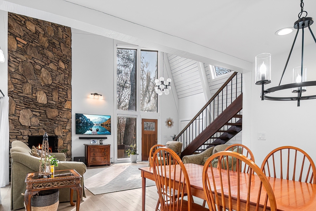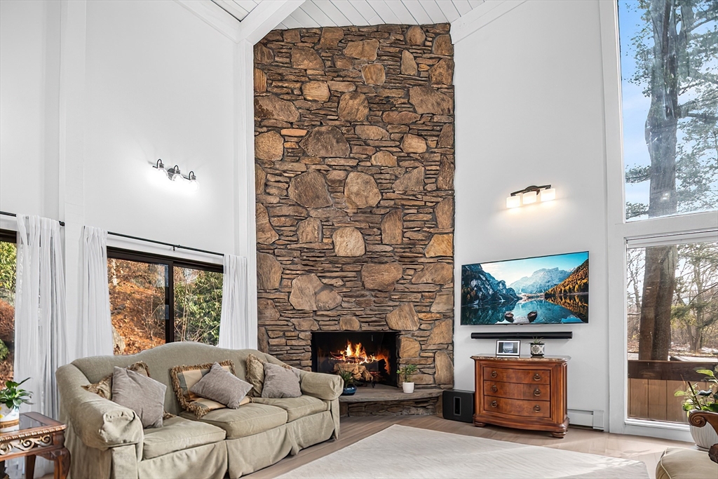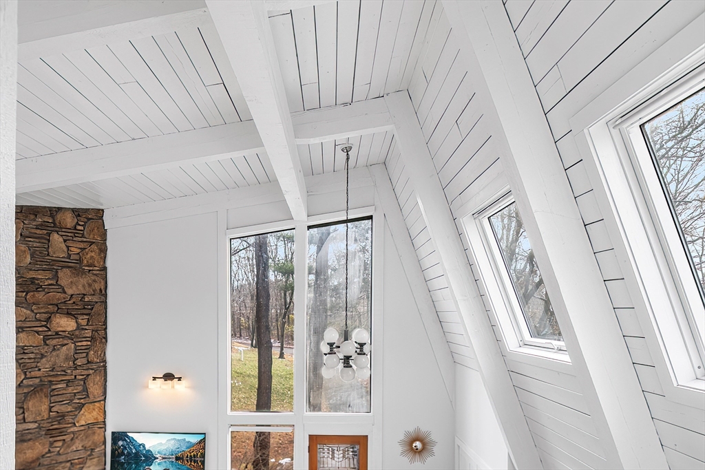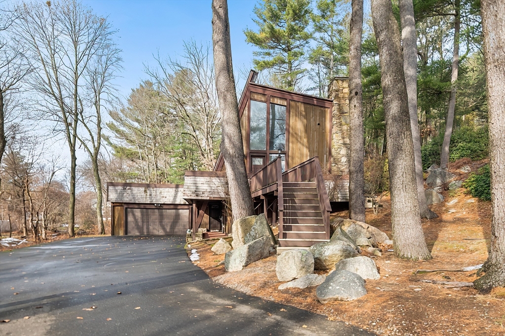 Welcome to this 1970’s Modern-style home in highly sought-after Lynnfield! This fully renovated property is set back from the street for added privacy and designed for sophisticated entertaining. The striking open-concept floor plan features soaring cathedral ceilings, massive glass windows, skylights throughout and a magnificent floor-to-ceiling rustic stone fireplace with rustic wood beams. The flow is ideal, transitioning from the living room to the dining area, which opens via multiple sliders to an expansive, wrap-around composite deck. The home features a brand new quartz kitchen and all-new bathrooms throughout. The cozy, lofted Primary Suite overlooks the main floor and includes an en suite bath and dressing area. The full, finished lower level offers extended living space with a second fireplace, two additional bedrooms, another full bathroom and access to the 2 car garage. This unique, light-filled architectural gem is a true must-see!