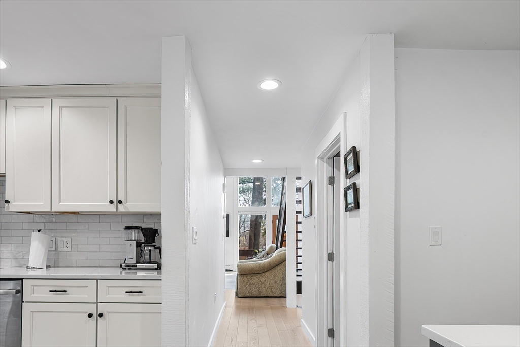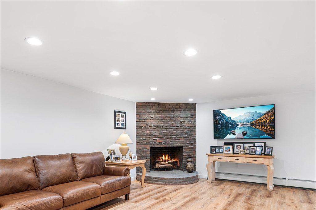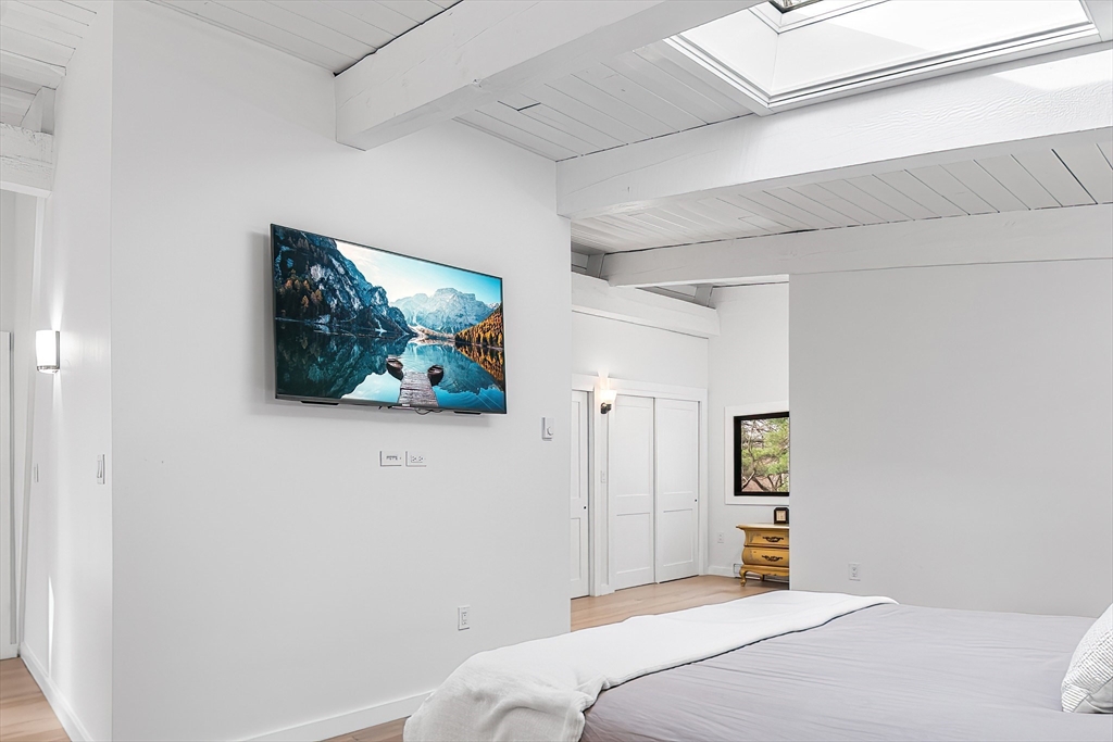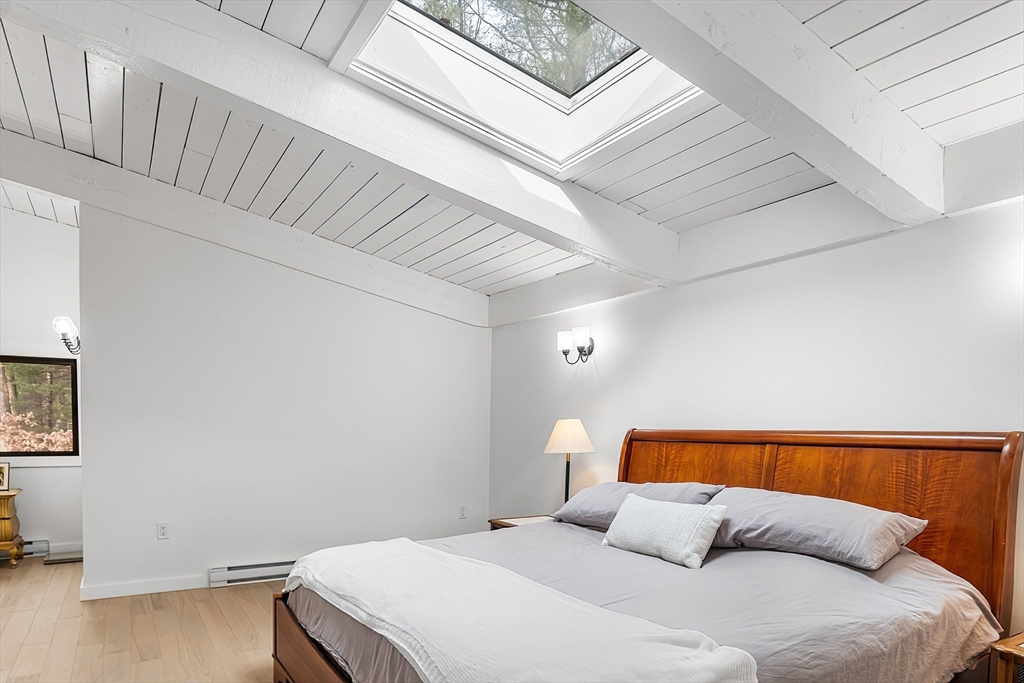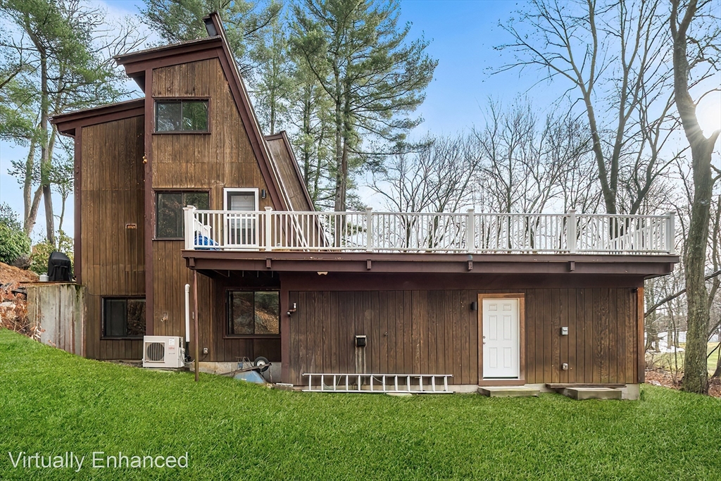 Welcome to this 1970’s Modern-style home in highly sought-after Lynnfield! This fully renovated property is set back from the street for added privacy and designed for sophisticated entertaining. The striking open-concept floor plan features soaring cathedral ceilings, massive glass windows, skylights throughout and a magnificent floor-to-ceiling rustic stone fireplace with rustic wood beams. The flow is ideal, transitioning from the living room to the dining area, which opens via multiple sliders to an expansive, wrap-around composite deck. The home features a brand new quartz kitchen and all-new bathrooms throughout. The cozy, lofted Primary Suite overlooks the main floor and includes an en suite bath and dressing area. The full, finished lower level offers extended living space with a second fireplace, two additional bedrooms, another full bathroom and access to the 2 car garage. This unique, light-filled architectural gem is a true must-see!