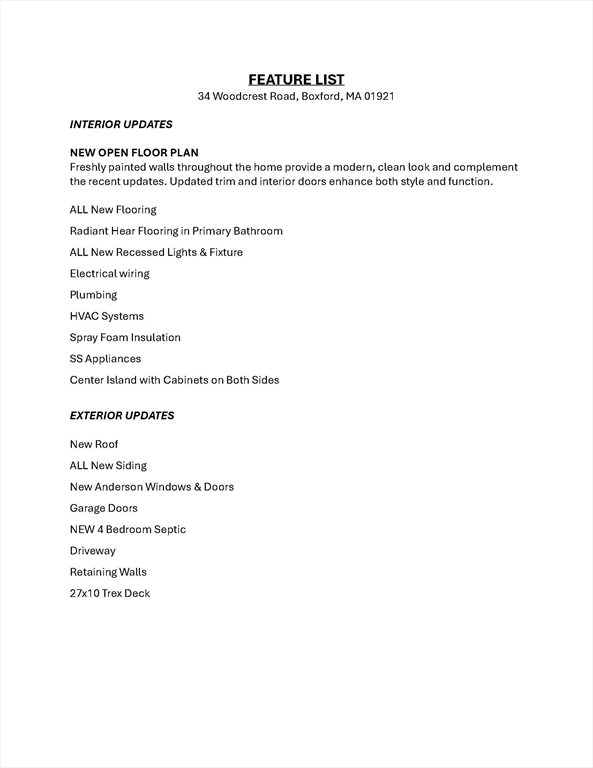 BEAUTIFUL NEW CONSTRUCTION in SOUGHT-AFTER E. BOXFORD NEIGHBORHOOD! One of E. Boxford's most desirable locations & minutes from Rt. 95, this stunning newly built home combines modern design w/classic New England charm. Expertly constructed on a pre-existing foundation, it reflects superior craftsmanship & thoughtful attention to detail throughout. This exceptional 4 Bed, 3.5 Bath residence offers a spacious, light filled & versatile open floor plan perfectly suited for today's lifestyle.Main level features 1st fl Primary Bedrm Ste, w/state-of-the art design & generous closets. A dedicated Home Office & Laundry make it convenient, functional & efficient.The heart of the home is the gourmet Kitchen, both practical & elegant w/quartz counters & expansive center island ideal for meal prep, entertaining & keeping your kitchen organized & clutter-free. The Dining area & LR w/FP lead to a spacious deck. 3 generously sized bedrooms w/custom closets on 2nd fl & HUGE Bonus Rm in LL. SEE FEATURES