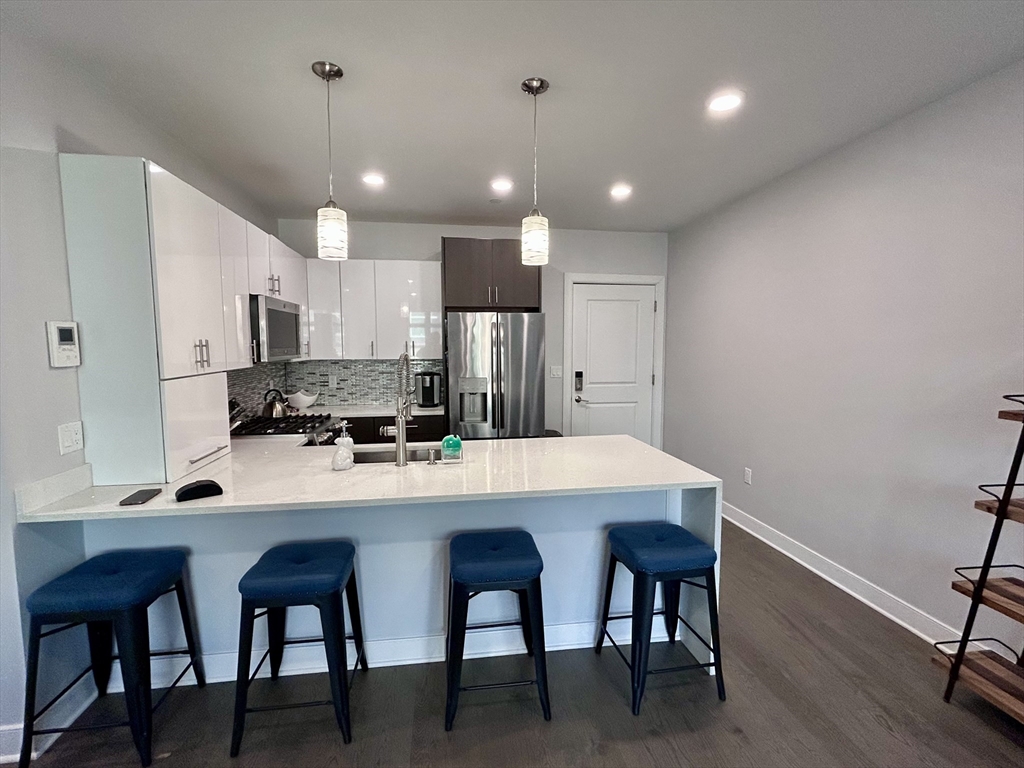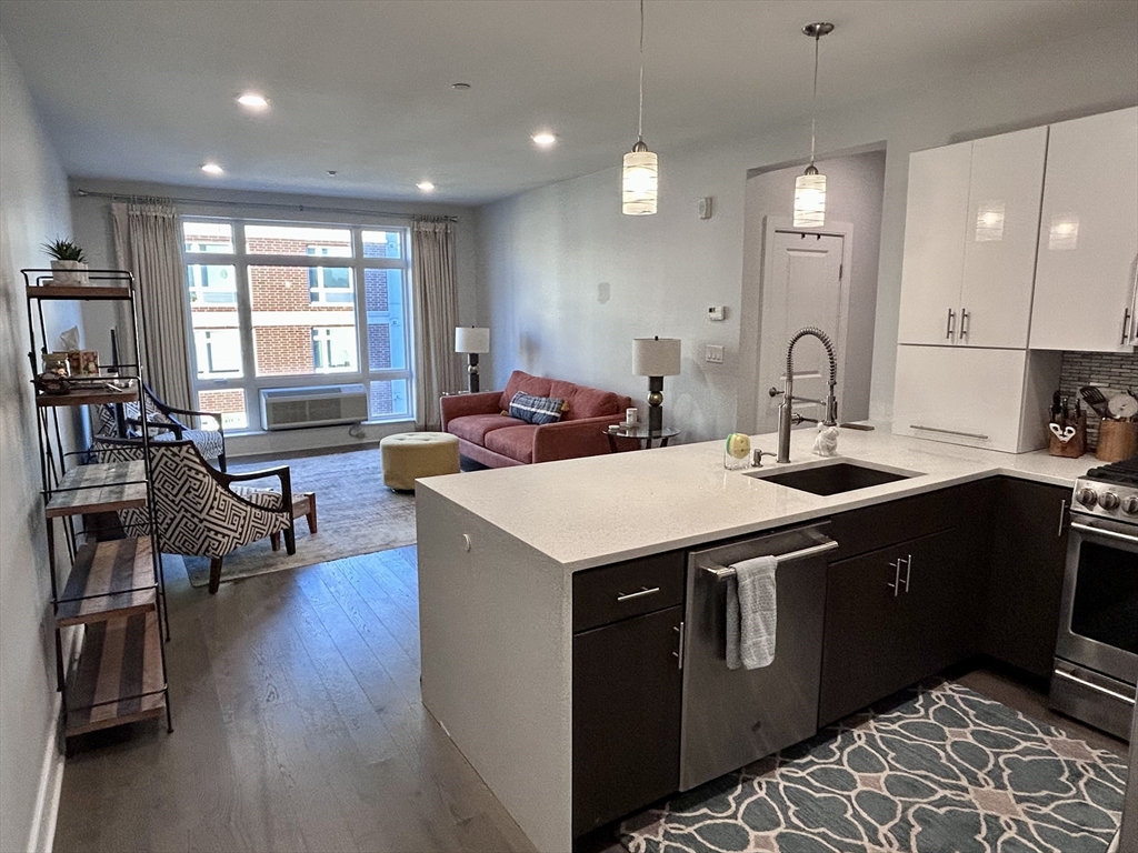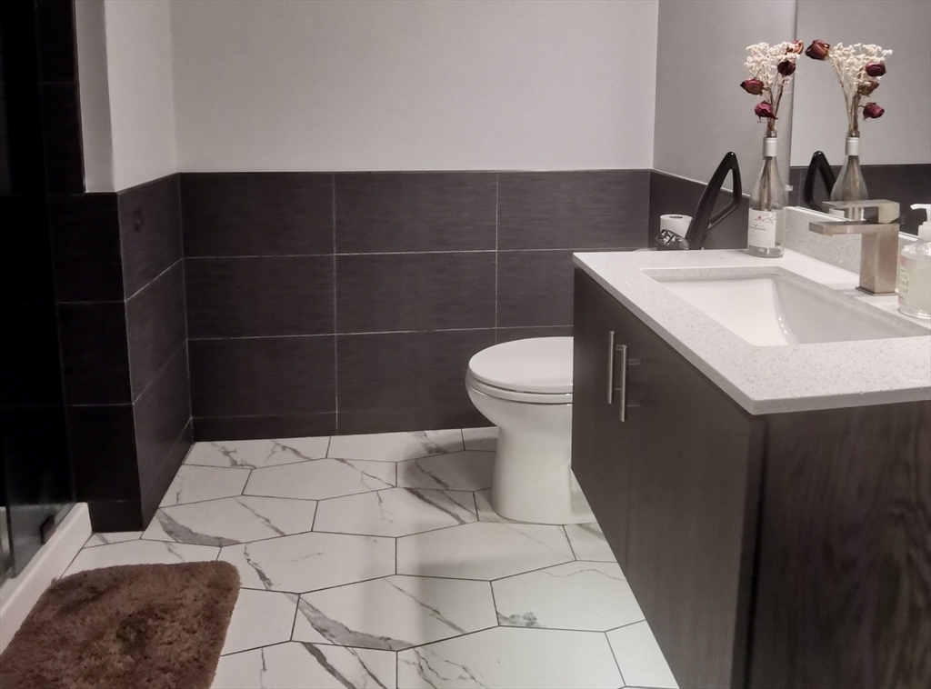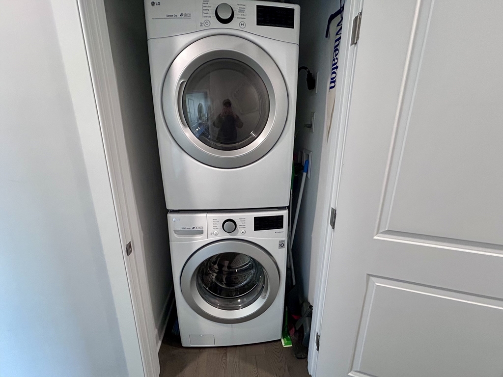 Available January 1, 2026. Located in the heart of Quincy Center. This unit offers an exceptional opportunity to experience comfortable living in a desirable location. When enter the welcoming front door, on the right side is the modern style open kitchen with quartz counter tops and stainless steel appliances. Huge window with bright sunlights shining the living room in gray wash wooden laminated flooring through out the unit. 2 Bedrooms with very spacious and ample closet space; Master walk-in closet. 2 Bathrooms ( one have tiled showers, floating vanities and heated floors: Master has a double vanity and large tub. Washer and dryer in unit. 1 assigned parking space under car garage. A city living within walking distance to T station, many restaurants and shop. Very easy access to highway 93.