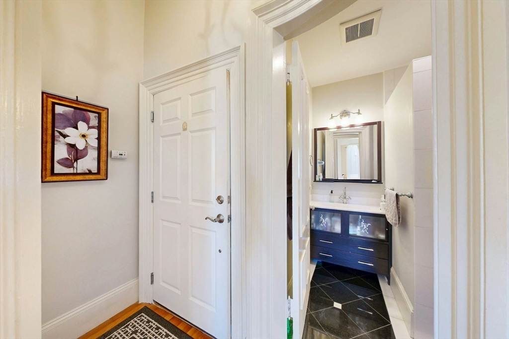 Sun-filling gorgeous one bedroom penthouse unit located center of the city with all the city live within walking distance. Great ceiling height. Southeast facing with Back Bay rooftop views. High-end kitchen with stainless appliances, absolute black granite counters and under-counter combo washer/dryer. Nice details throughout with crown moldings, panelling, a handsome fireplace and mantle with marble surround, huge custom walk-in closet, inlaid hardwood floors, marble bathroom with tiled shower and glass door. Assigned basement storage locker.