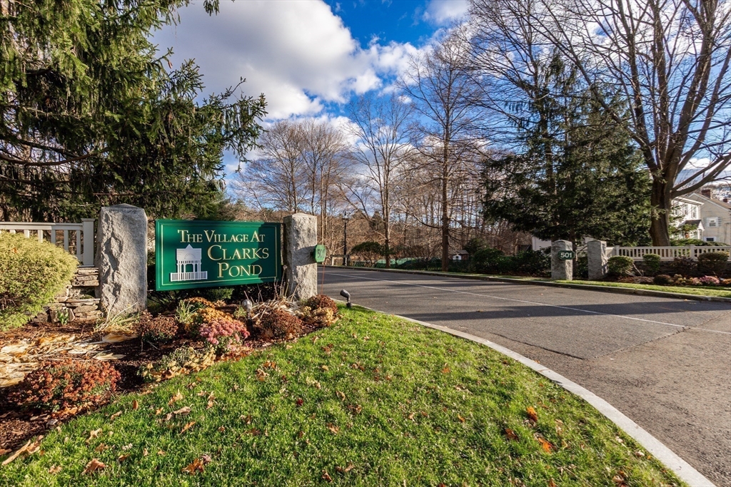 Excellent opportunity to own a first floor, single-level unit at The Village at Clark's Pond! Enter into the spacious and sun-filled living room, complete with gas fireplace and slider to private deck, overlooking a beautiful view of acres and acres of nature and conservation land. Custom kitchen with updated stainless steel appliances, custom wooden cabinets with 2 display glass fronted, spacious pantry and an easy maintenance Silestone countertop. Generous sized master bedroom with en suite bathroom and walk-in closet. Second bedroom offers a full size Murphy bed....the room can be converted from an office to bedroom in a snap! Second bedroom double closet offers built-ins, shelving and a file drawer. Garage and deeded parking conveniently located just outside of the building entrance. Systems updated and well maintained. This unit is move-in ready. All located with-in easy access to highways, shopping and transportation. Miles of walking trails accessible to the complex!