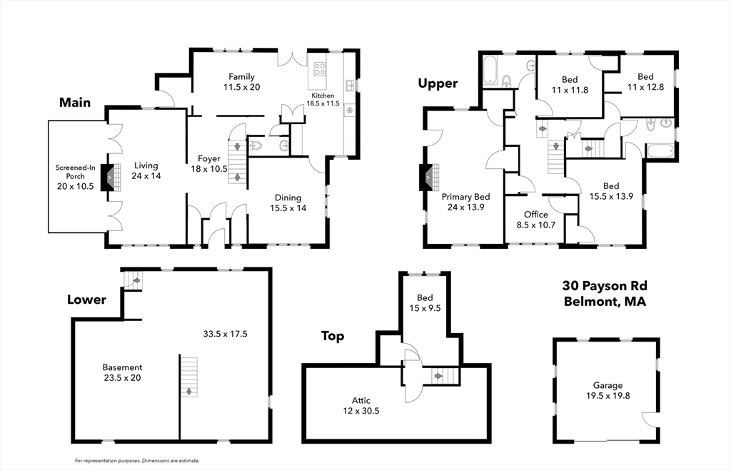 A rare opportunity! This distinguished colonial on Payson Road sits proudly on an oversized lot framed by mature trees in one of Belmont’s most desirable neighborhoods. This grand home, with hardwood floors throughout, offers over 3,100 sq ft of living space with room to expand, inviting your vision to restore its elegance or reimagine its future. Sunlight fills the spacious rooms of this 5-bedroom, 2.5-bath home, featuring a classic center entrance with a grand staircase; a front-to-back fireplaced living room opening to a screened porch, a dining room with original plate-rail wainscoting and leaded-glass windows flowing into the kitchen & family room, with windows showcasing the tranquil backyard. The 2nd floor offers a large primary bedroom with a fireplace, 3 additional bedrooms, an office, and 2 baths. The 3rd floor offers the 5th bedroom and attic space. A full unfinished basement and 2-car detached garage complete the package. Ideally located in the heart of Cushing Square.