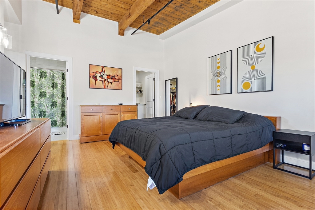 Historic charm combined with the modern luxuries of today in this stunning condo in sought after Howe Shoe Factory Condominiums! Sunfilled, open and airy floor plan which boasts state of the art kitchen with s/s appliances, center island, quartz countertops and cabinet space galore. This dynamite kitchen opens to living room and dining room with 9ft vaulted wood ceilings and bamboo wood flooring. Your primary suite is large enough to include a sitting area complete with walk in closet and en-suite bath. Both bedrooms with soaring wood ceilings and bamboo wood flooring. Gorgeous baths with tub/shower, tile surround and tile flooring. Laundry in unit stackable washer/dryer stay. 75 sq ft storage room on lower level. Minutes to highway, downtown and the Apex Center! This top unit penthouse is a real creampuff.