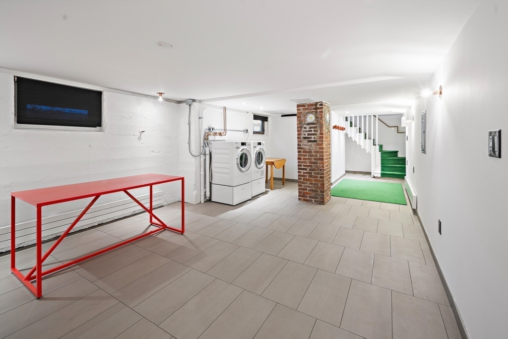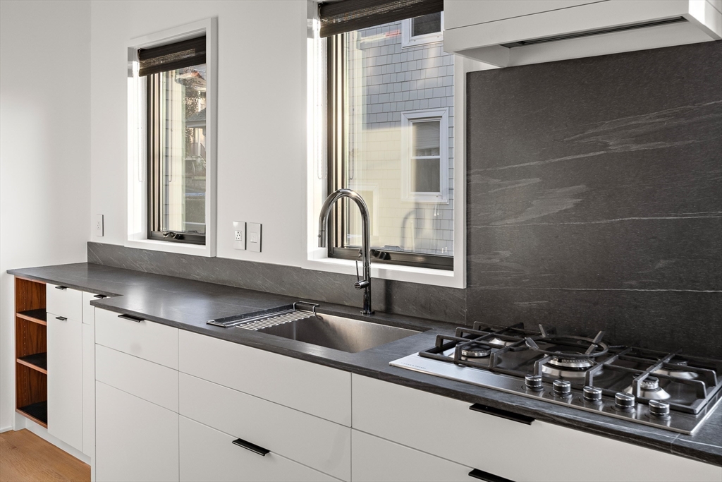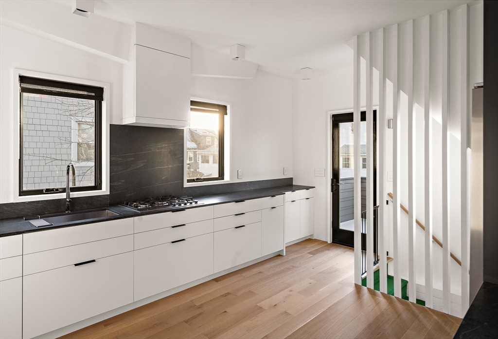 Renovated Craftsman-Style apartment with 7 rooms, 2+ bedrooms, 2 full modern bathrooms of a classic 1918ca two-family. Located 2 blocks from Cushing Square, this unit features modern amenities and old-world charm. Contemporary kitchen with high-end European stainless steel appliances, stone countertops, oversized windows and and a Southwest facing deck for lovely afternoon sunsets. Open & airy throughout with period architectural details including beamed-ceilings, wood burning fireplace, French Doors, hardwood floors and built-ins.. One bathroom renovated with classic subway tile, deep soaking tub and German fittings. The other bathroom has a walk-in curbless shower with European fittings and heted floors. Large yard, 2-car parking, newer gas forced hot water heating with multiple zones, ample storage and tons of light throughout. Pet friendly & lead-safe compliant.