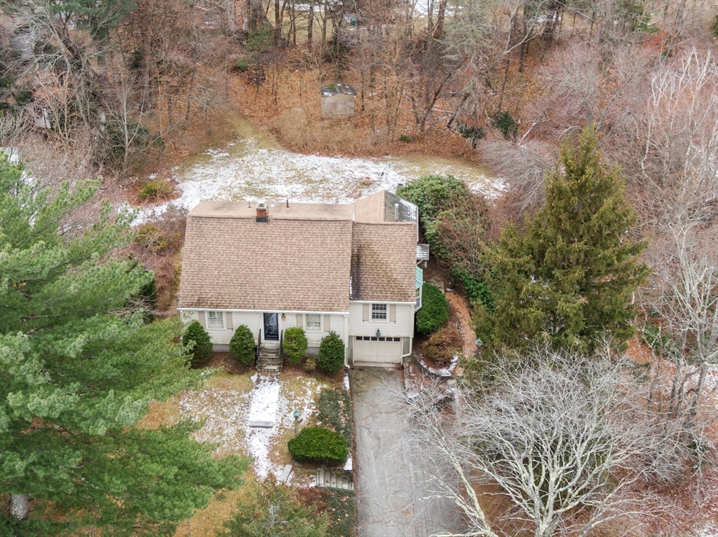 Not a drive-by! This charming Cape-style home is sits on a half-acre lot, set back from the main road for privacy while offering convenient access to local amenities, major routes, and is just steps from the express bus to Boston. Enter the spacious dining room with hardwood floors that flows into the kitchen featuring stainless steel appliances, including a gas range and granite countertops. The cozy living room offers a window seat and a gas stove to keep you extra warm on those chilly nights, and opens to a four-season sunroom with sliders leading to a private, wooded backyard and deck. Two well-sized bedrooms and a 3/4 bath complete the first floor. Upstairs offers two additional bedrooms, a 3/4 bath with shower, and walk-in attic storage. The unfinished basement provides great expansion potential. One-car garage, newer furnace and French drain in basement. Nicely sited with backyard privacy. The perfect place to make your own!
