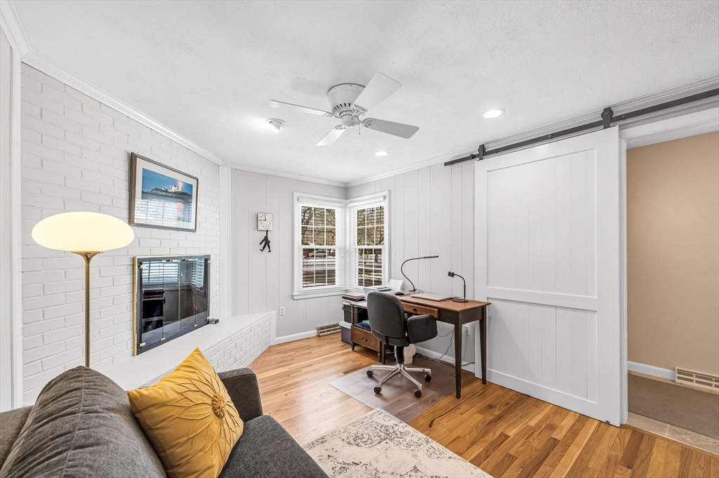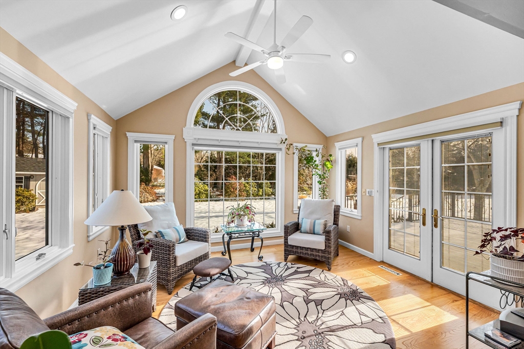 CENTER OF TOWN RANCH! Exquisitely maintained 7 rm Ranch w/great floor plan & many newer windows. Refinished hardwood floors thru-out. Fabulous CONDO ALTERNATIVE! Interior recently painted. Updated kitchen w/ granite counters, cherry cabinets, SS appliances, double wall ovens & dining area. Triple pane kitchen windows & newer LR & sunroom windows. Custom shades too. Open floor plan, LR & DR both flow into beautiful sunroom addition w/ vaulted ceiling, views to private back yard & French door access to deck w/2025 retractable awning. Professionally landscaped grounds w/ plants blooming in seasonal rotation. Den w/ fireplace can also be home office or bedroom. Primary bedrm offers garden views, walk-in closet & updated full bath. Hall bath updated w/ new glass shower door & granite vanity. 2 cedar closets/ 1 walk-in below. OWNED SOLAR PANELS-ZERO electric cost past 4.5yrs APO. Paver walks to front & side doors. Large storage shed. 2 car garage w/ newer overhead door. Circular driveway!