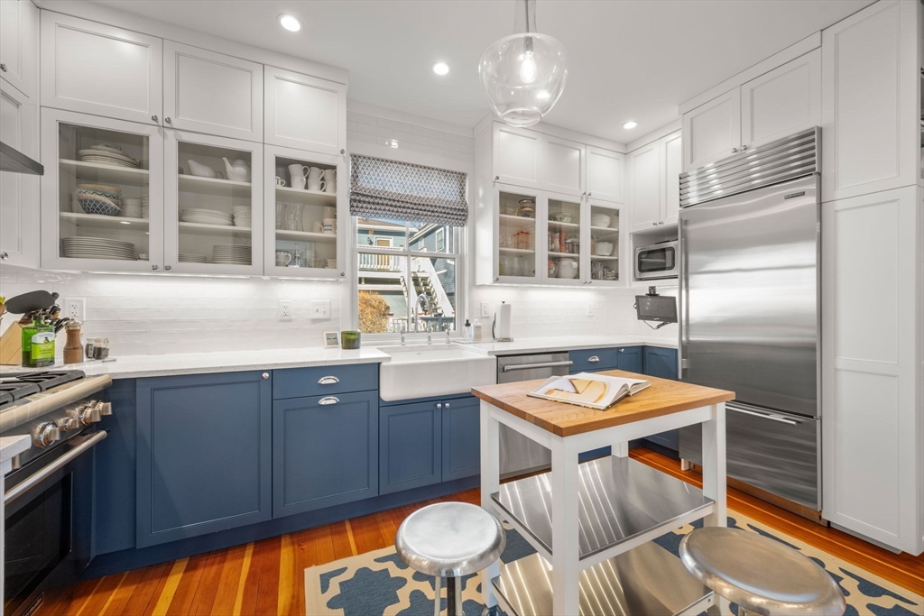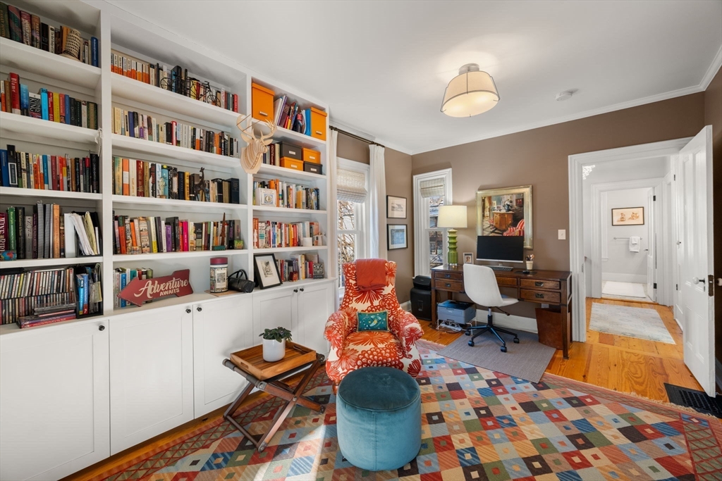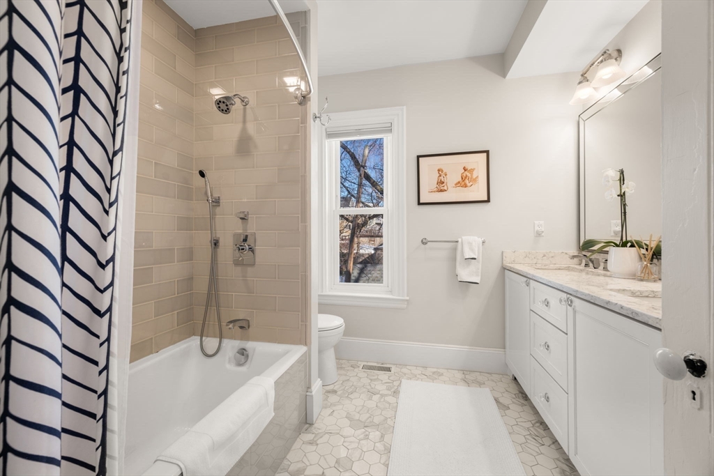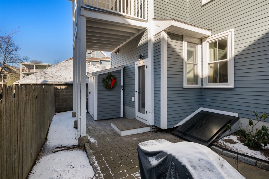 Tucked away at the very end of Mead St, a leafy side street between Davis & Teele Sqs, this most charming single family with a white picket fence is a true delight. Thoughtfully updated by the owner, the property features a gracious 1st fl with great flow, 3 bedrooms on the 2nd fl & a finished 3rd fl. Open living/dining w bay window, gas fireplace, custom built-in w wine fridge, and French doors leading to a stone patio. The kitchen is defined by its perfect work triangle w well-designed storage, lighting, and good quality appliances. Off the kitchen is a petite mudroom with window seat that leads to the back patio & to the full, unfinished basement. The 2nd fl features 3 BRs, 1 w custom built-in & access to a covered balcony. The large marble bath has a double vanity, soaking tub, and window. The open plan 3rd fl - study, yoga space? - has a skylight & walk-in closet. Addtl features include central A/C, custom blinds, half bath, fully fenced property, storage shed, and an EV charger.