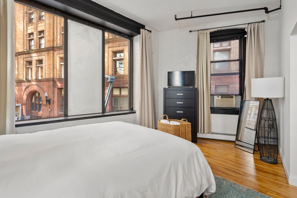 Nearly 1600 square feet of dramatic loft space, all on one floor! Currently configured as a two bedroom/1.5 bath home, but could easily be converted to a three bedroom/two bath with minimal work and still allowing for a copious living space and designated dining space to seat 8-14. Primary suite has attached bath, washer/dryer and tall windows.The second bedroom is on "The Nose" of the building granting this space Southern and Eastern light and is accessed by the original sliding warehouse doors. Over a dozen oversized windows in this phenomenal space featuring high ceilings, antique, factory hardwood floors, white brick walls and corner exposure. Open design kitchen w/ butcher block peninsula, perfect for entertaining & stainless countertops. This unicorn of a building recently had a new roof, all new windows, high tech security system added, butterfly entry system added, pointing of the building & renovation of common areas. Condo fees inc hardwired high-speed Internet! Pets welcome.