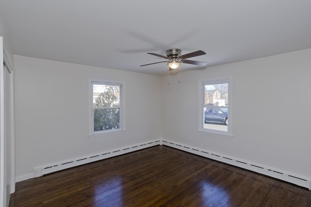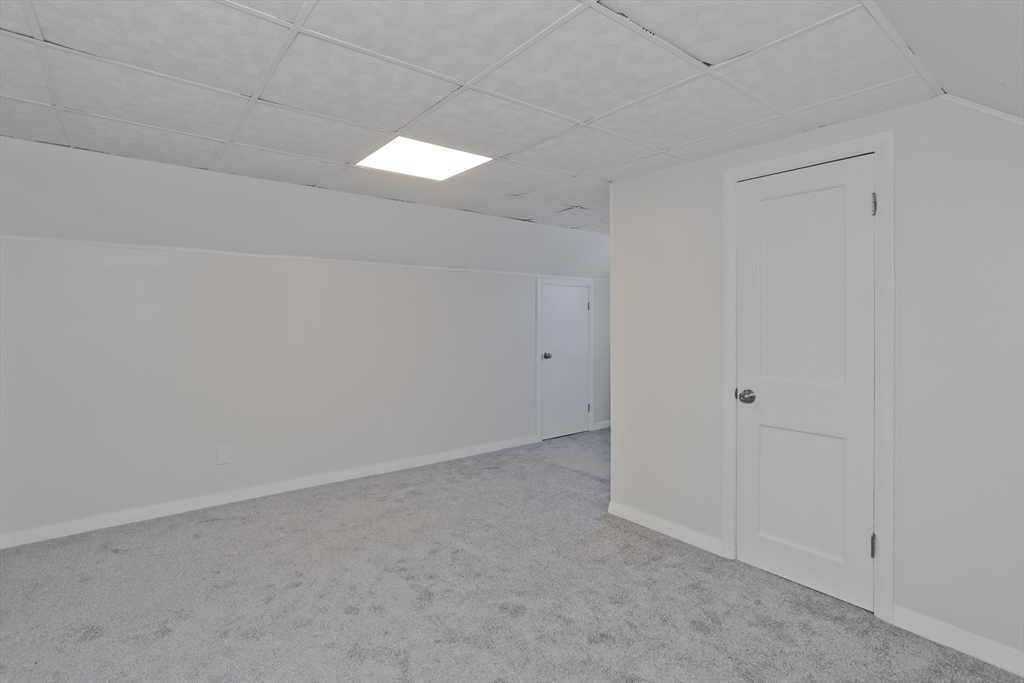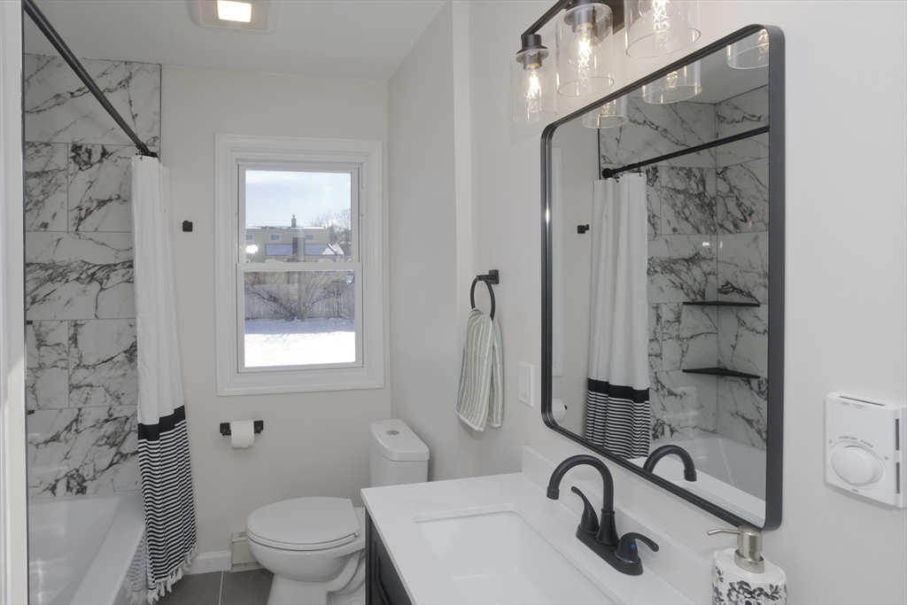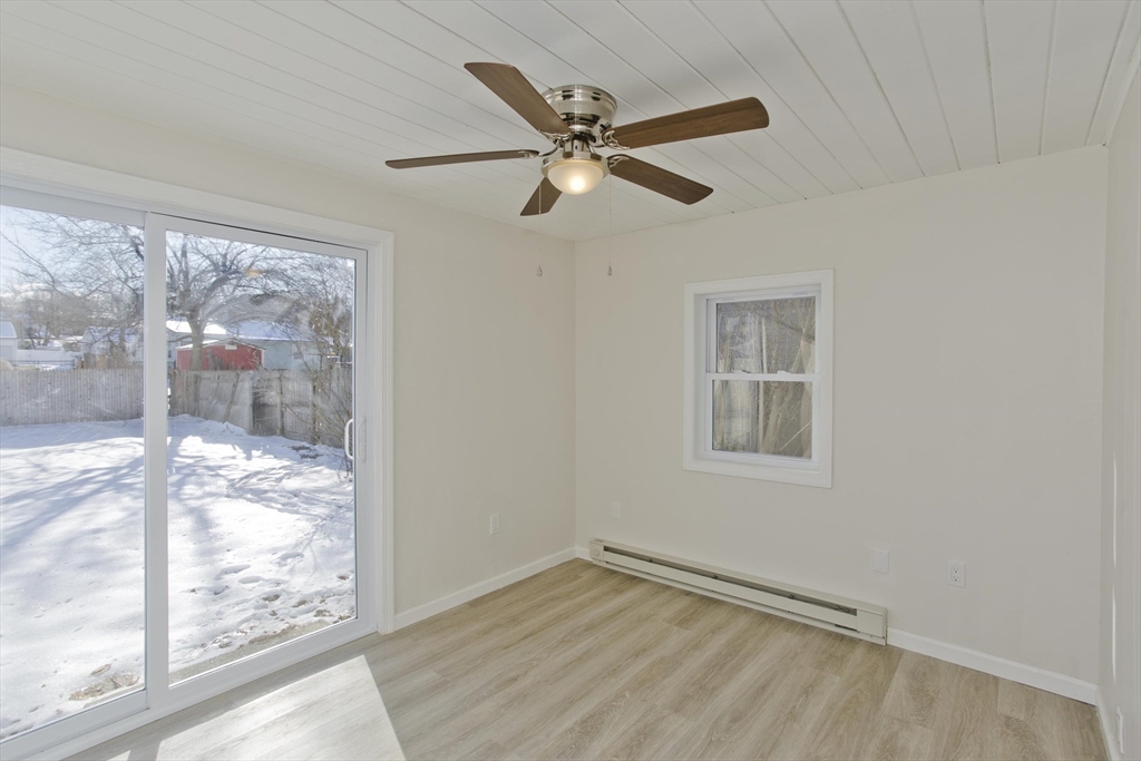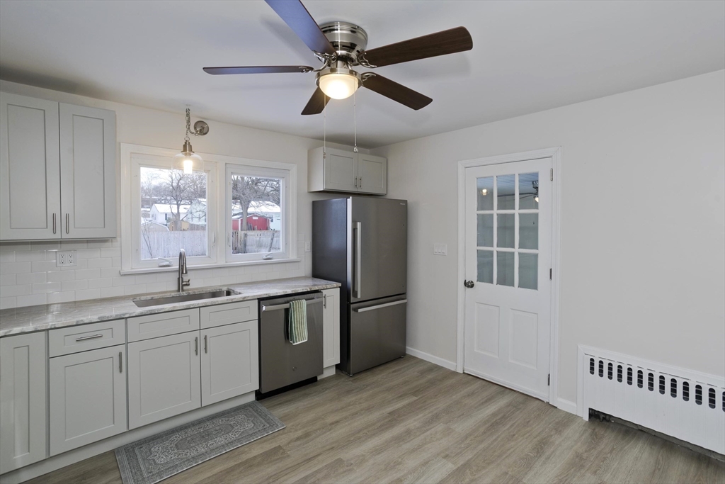 Welcome to this beautifully updated Cape-style home offering 3 bedrooms, multiple bonus spaces, and 1.5 baths. The exterior features new vinyl siding, a durable metal roof, a brand-new garage door on the attached one-car garage, and a double-wide driveway. Inside, enjoy a sparkling new kitchen with natural quartzite countertops, a remodeled full bath, refinished hardwood floors, luxury vinyl plank flooring, and ceiling fans throughout. The main-floor full bath is complemented by a half bath in the basement for added convenience. Off the kitchen, a heated sunroom/den with a sliding door to the backyard provides ideal year-round living space for dining or relaxing. Upstairs offers a large bedroom plus bonus space with a cedar closet and new wall-to-wall carpet, perfect for a home office, playroom, or flex use. The spacious backyard is nearly fully fenced, and laundry hookups in the clean, well-lit basement complete this move-in-ready home.