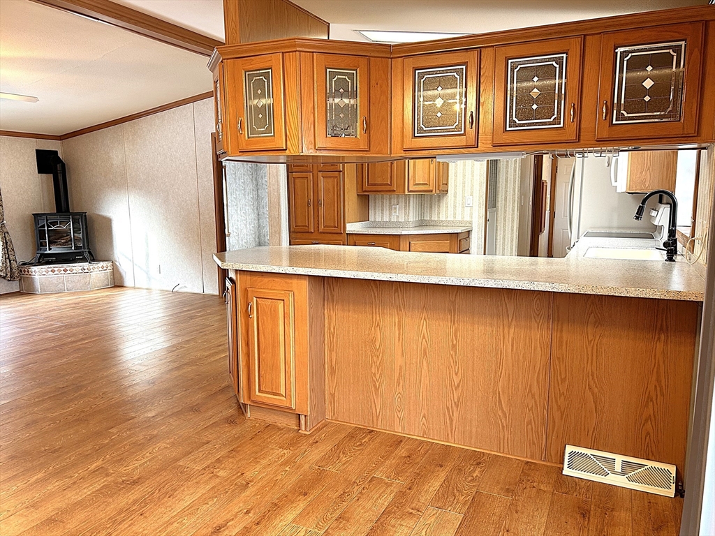Meticulously maintained, updated and move-in ready, this bright manufactured home sits on a spacious, level corner lot with composite deck, two sheds, greenhouse, raised gardens, and mature perennials. The sun-filled kitchen features solid-surface counters, skylights, and abundant cabinetry. An open layout with a cozy propane stove is ideal for entertaining. Three bedrooms offer walk-in closets! The furnace is only about 1 year old! Enjoy a park-like community with indoor pool—don’t miss this one!