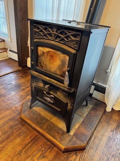 This lovely Village Colonial could be your next home address. Set on a fenced lot in the Village Business Zone it's the perfect location for a home business. Features include hardwood flooring, replacement windows, newer roof, siding, kitchen, deck & boiler (see Documents for dates). First floor offers formal living room, dining room with pellet stove, & kitchen with breakfast bar & slider to the composite deck. A turning staircase leads to the second floor where 3 bedrooms & a remodeled bath reside. All bedrooms have ceiling fans and the Main bedroom offers a walk-in closet. If you wish to expand your living area there is also a staircase to attic storage space as well as an enclosed sunroom porch, and a partially finished walk-out basement where former owners once ran their flooring business. There was once a half bath in the basement with potential to restore. The home is serviced with town water and sewer and has 4 parking spaces available in the U-shaped paved driveway.