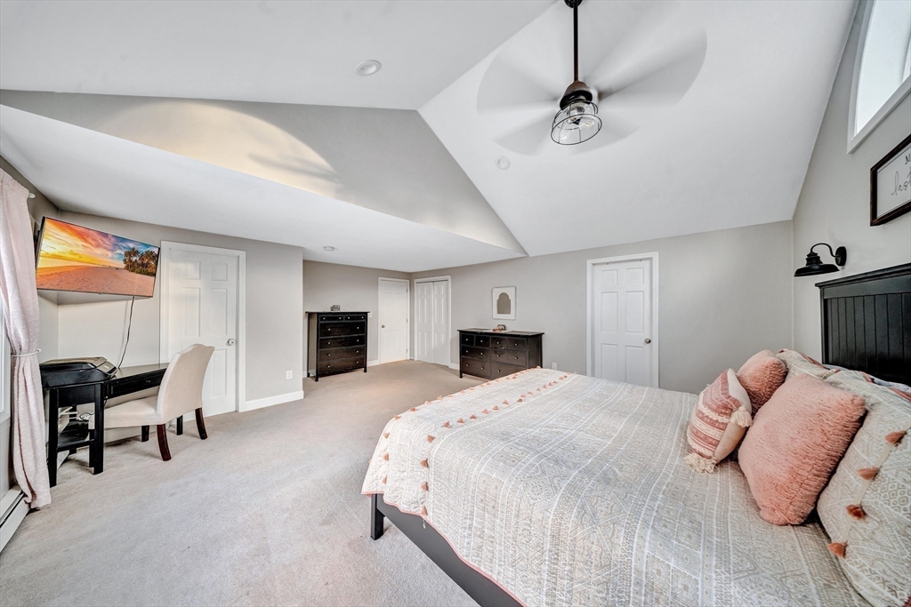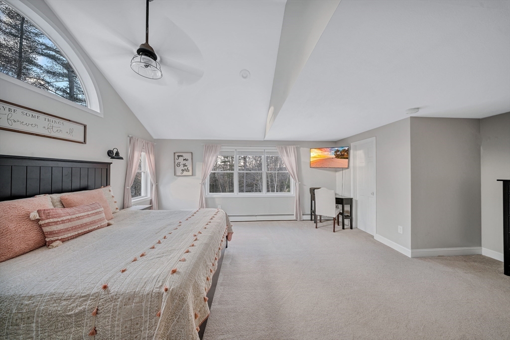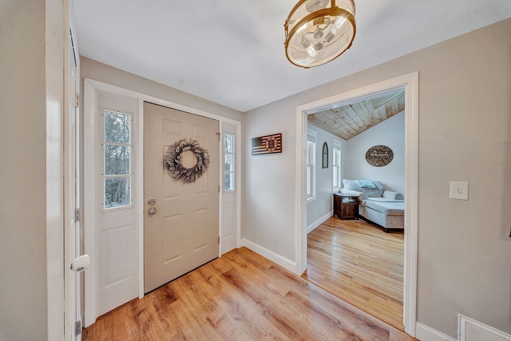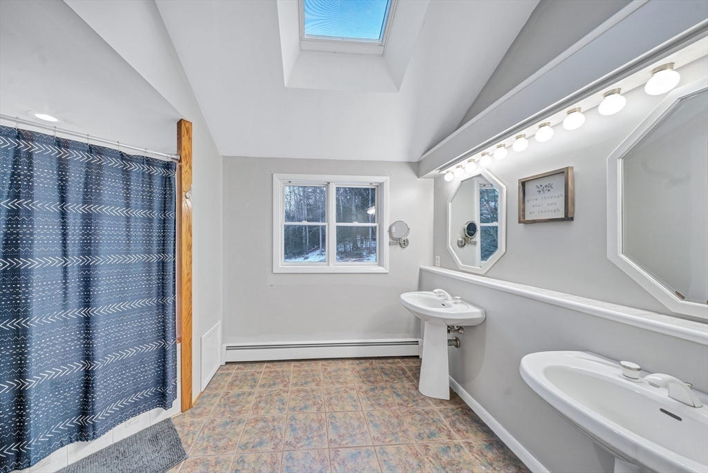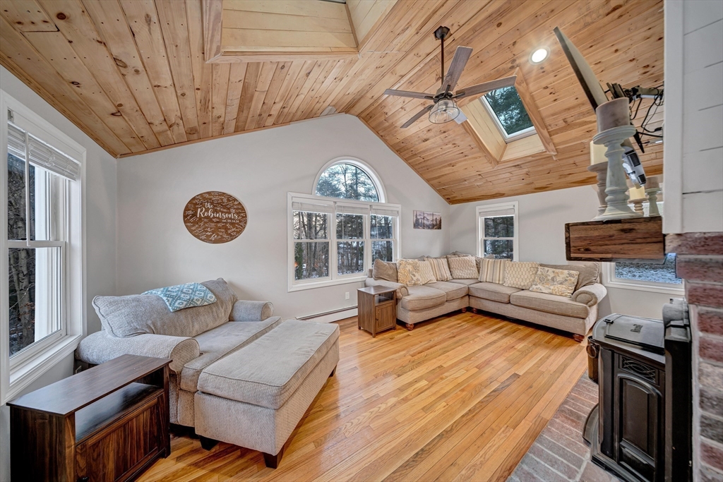New Year, new home! Welcome to this beautifully maintained Garrison Colonial offering timeless charm with thoughtful modern updates, including a new septic system and new roof. A spacious mudroom with heated floors welcomes you into a bright, expansive kitchen featuring stainless steel appliances, an induction cooktop, a large center island, and an open dining area, perfect for gatherings. The living room impresses with vaulted ceilings, skylights with automatic sensors, and a recently installed pellet stove insert, creating a warm and inviting atmosphere. All three bedrooms offer dual closets, while the primary suite showcases vaulted ceilings and a private ensuite bath with a tray ceiling and skylight. Natural light fills the home throughout. The partially finished lower level, previously equipped with flooring and a full bath, provides excellent potential for additional living space. Move-in ready and full of character, this Colonial blends classic design with modern comfort.