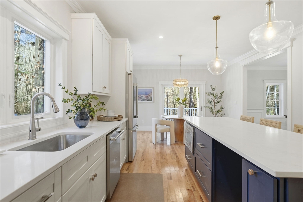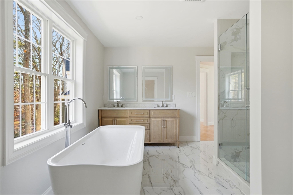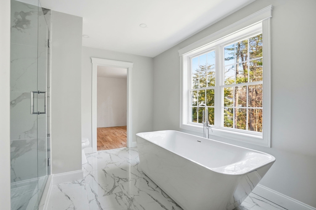 This exceptional new construction home offers serene North River views and three levels of beautifully finished space, including a walk-out lower-level ideal for in-laws with a private fourth bedroom, spa-like bathroom, spacious living areas & plumbing for a future kitchen or entertainment suite. Custom molding, detailed trim, luxury finishes, and hardwood floors create a refined, designer feel. The main level features a stunning kitchen with Thermador appliances, beverage fridge and Calcutta Gold Quartz counters. Multiple dining areas, a formal office and a massive family room with a warm fireplace, vaulted ceilings, and abundant natural light. The primary suite includes a high-end bathroom, custom walk-in closet, workspace, and extra storage. Two additional bedrooms, a shared bath, and laundry complete the second floor. A perfect blend of luxury, comfort, and privacy in one of Norwell’s most prized locations-minutes to Scituate beaches, the commuter rail, shopping & top-rated schools