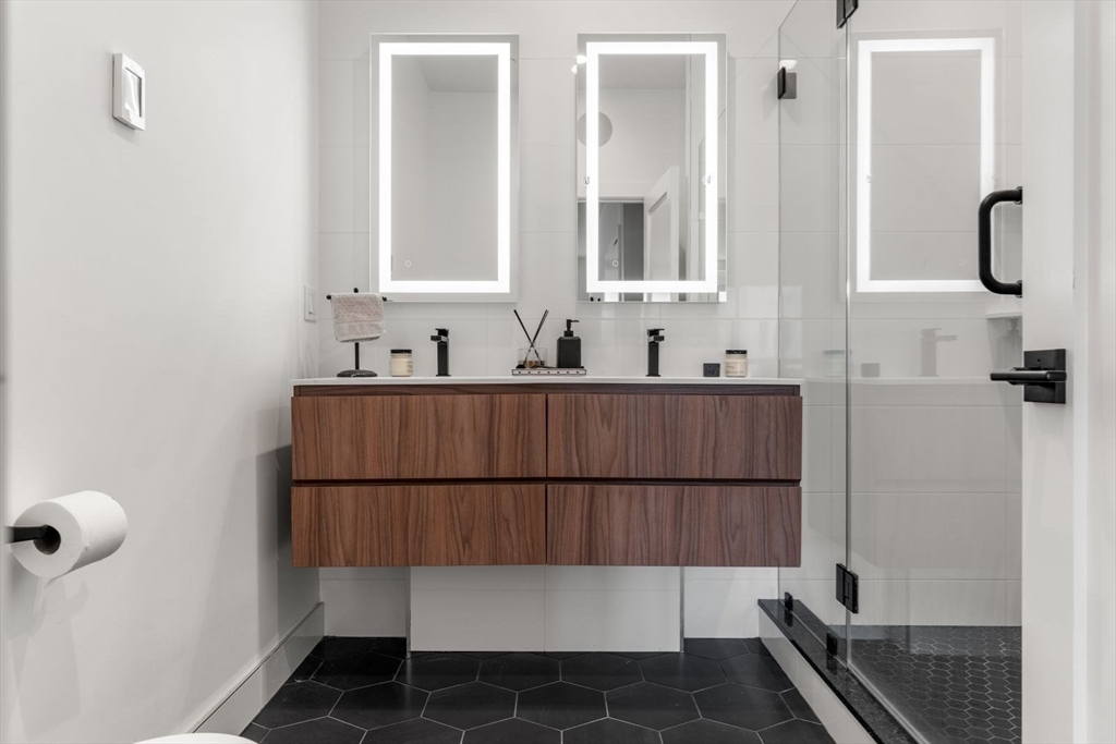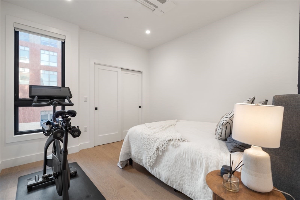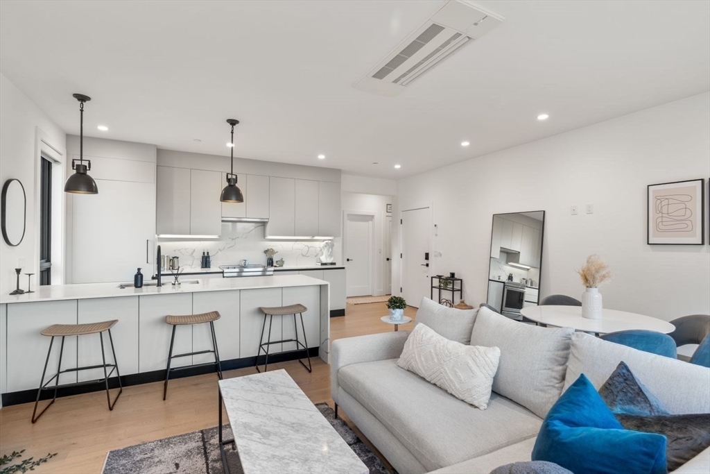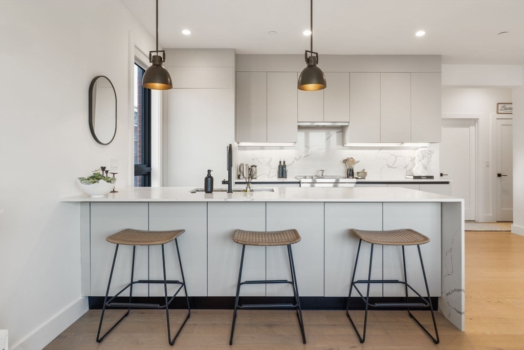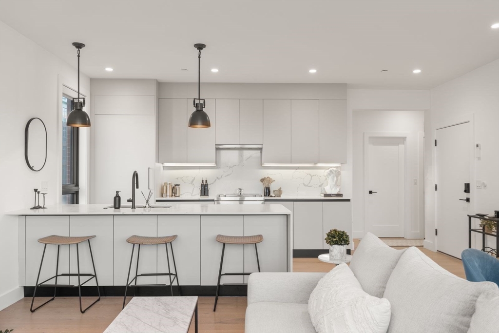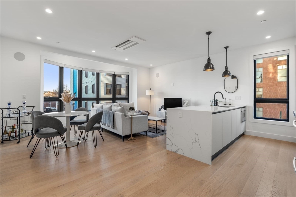 Enjoy luxury condo living at 75 on West. This impressive 2 bed residence was built in 2020 with striking architecture & high-end finishes. The complex is perched above Reunion Cafe at the corner of A St & W Broadway -- one of Southie's most prominent & bustling corners. Ideally located for city-dwellers, just one block from the Broadway T Stop & multiple highways with ease to Seaport, South End & Downtown. Floor-to-ceiling curved windows fill the space with natural light and showcase sweeping neighborhood views. The thoughtfully tailored open kitchen features custom cabinetry, under-cabinet lighting, waterfall quartz countertops & stainless steel appliances. The spa-like bath include sleek tiled shower, frameless glass enclosure, floating double vanity, and matte black fixtures. Building amenities include an elevator, shared gym, deeded storage & off-site garage parking. Additional features include keyless entry, intercom, surround sound, ductless mini splits & in unit w/d.
