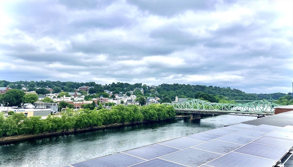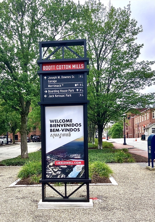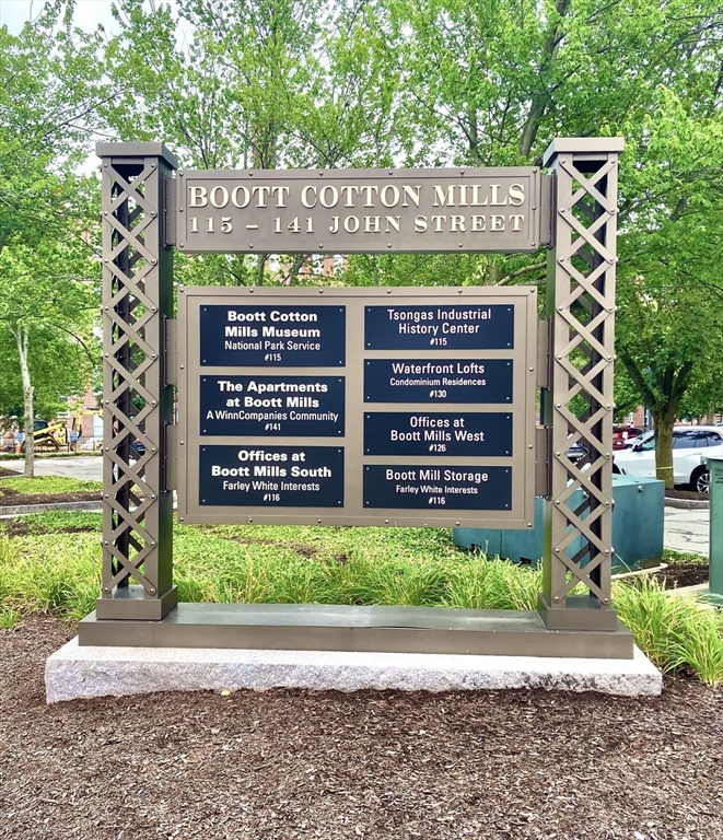 The Boott Mills Condominiums in Lowell are located on the Merrimack River. This condominium is situated in a historic mill complex with some waterfront views. The complex is part of the Lowell National Historical Park. This open concept unit has an industrial feel with high ceilings & wood beams. A beautiful brick wall that adds character, large windows that let in lots of light. Flooring is stained concrete. Brand new cooling/heating system & new faucets. Large bathroom with walk-in shower & stackable washer & dryer. Kitchen has updated cabinets with stainless steel appliances, granite countertops, & pendant lighting. The complex offers a Shared game room, Entertainment room with full kitchen, Gym, Storage room for delivery packages, garden area & a roof top deck with river views. This walkout unit is ground level & walks out to the front courtyard. Walk to the top of the street where the trolley runs, walk to restaurants, shops, schools & Boarding House park for picnics & concerts.