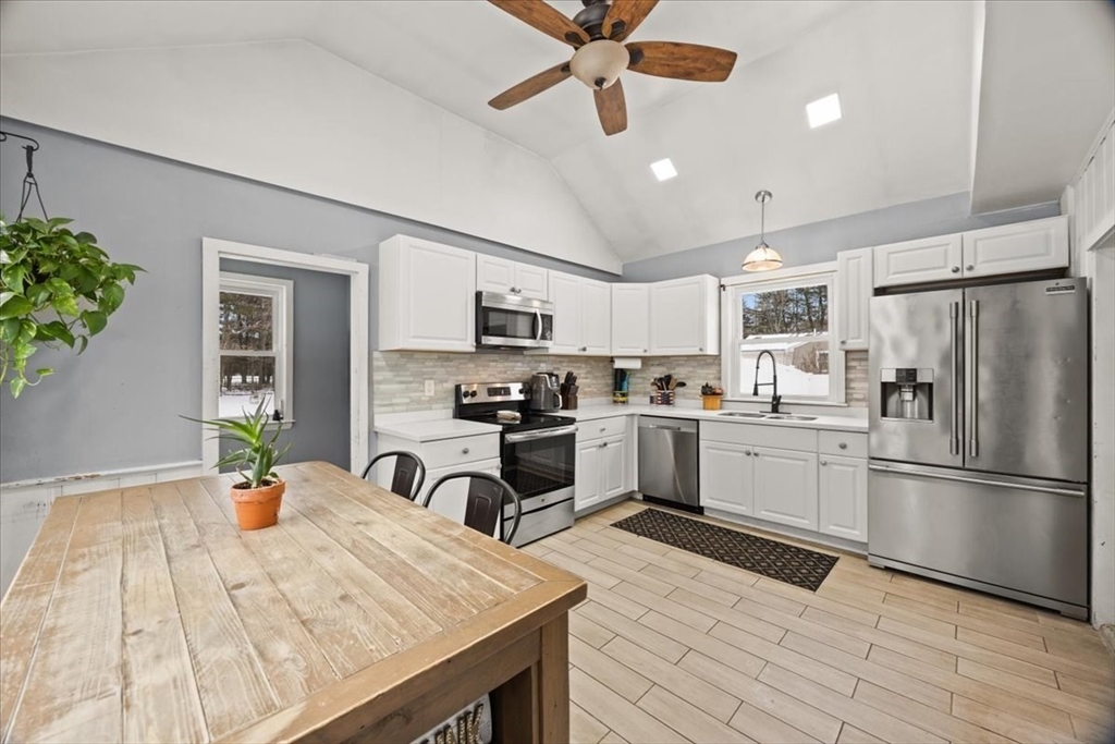 Well-maintained antique Cape offering a blend of historic character and modern updates throughout. This 3 bedroom, 1 bath home is located in the desirable town of West Bridgewater with convenient access to Route 24 and is set on nearly one acre. The home features a total of 3 fireplaces, hardwood floors, an updated eat-in kitchen with vaulted ceilings, stainless steel appliances, Corian countertops, and recessed lighting. Newer improvements include an updated bathroom, heating system, energy-efficient windows, and roof. The first-floor primary bedroom includes a wood-burning fireplace and walk-in closet. Hardwood flooring is featured throughout the home. The second level offers two spacious bedrooms with ample closet space, as well as a large office suitable for home or flexible use. Close to area shopping, schools, and restaurants.