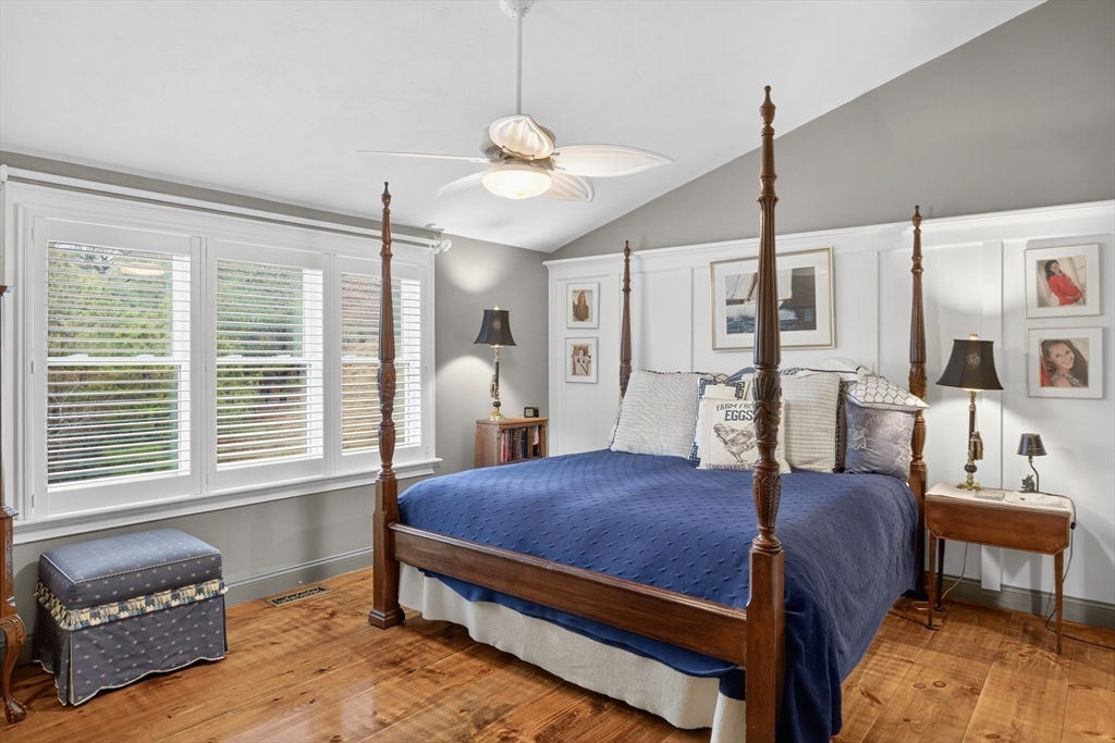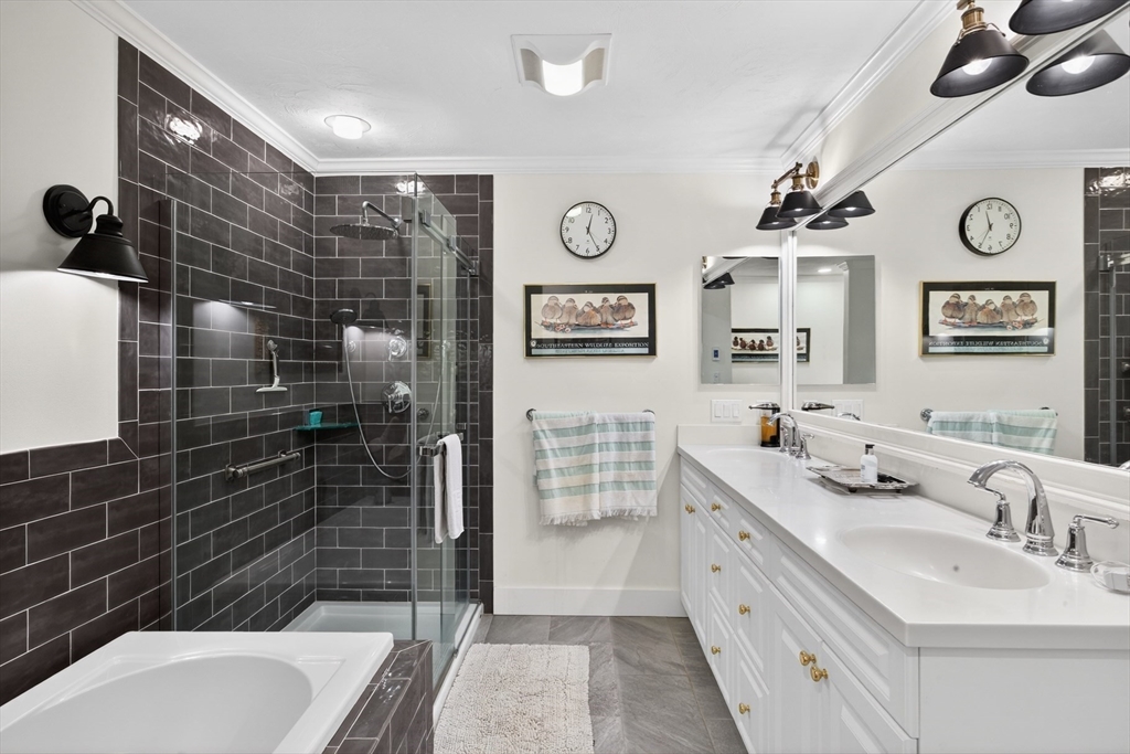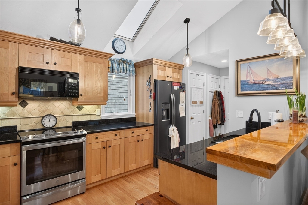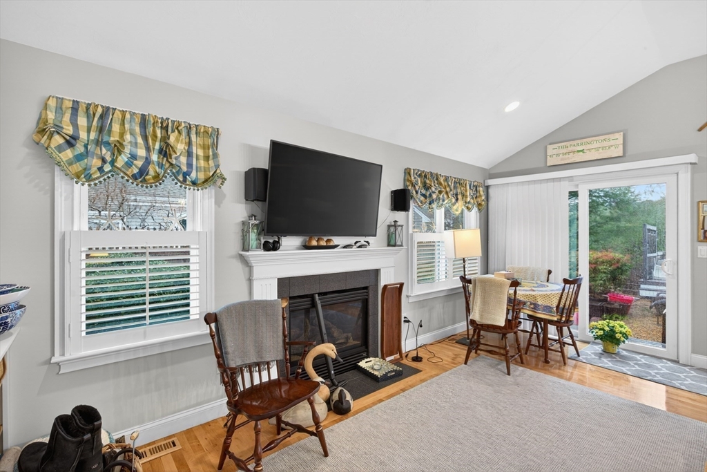 BEAUTIFUL SUNSETS to be enjoyed from this Green Company "T" style home with new building envelope. Located in Winslowe's View in The Pinehills with lovely courtyard and beautiful gardens. Bright living room/ dining room combination w/ hardwood flooring, vaulted ceiling, recessed lighting, fireplace, and slider to large deck. Kitchen w/ granite, upgraded cabinetry and tiled back splash opens to family room w/eat-in area, built-ins, plantation shutters, vaulted ceiling and slider to your courtyard. Renovated primary suite with wide plank pine floors on the first floor w/ custom wainscoting, walk-in closet, soaking tub, tiled shower in the beautiful primary bath w/ linen closet and double vanity sinks. Second level with large loft, spacious guest room and full bath. The finished walk-out lower level has a workshop, office w/ French doors, extra storage, + family room with crown molding, recessed lighting + electric fireplace plus sliders to the patio/backyard.
