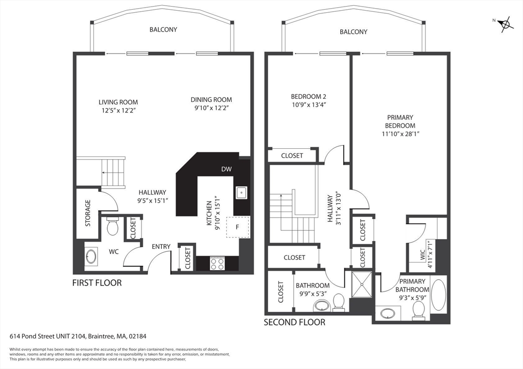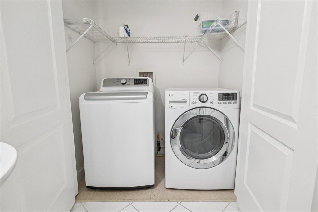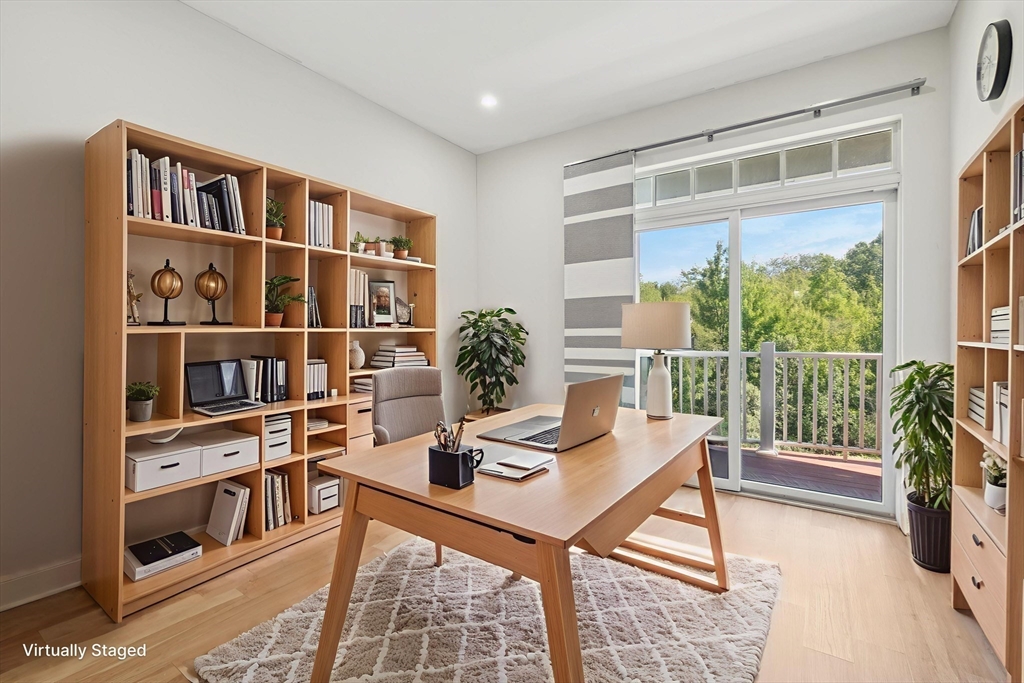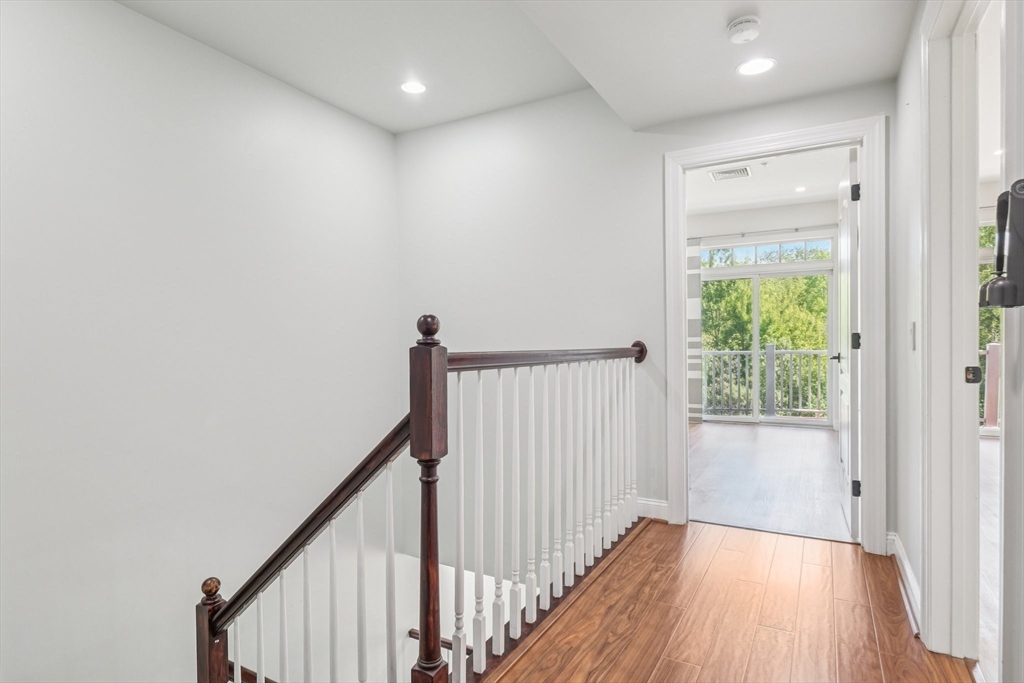 Two level condo at Reservoir Crossing with 1,449 square feet, two bedrooms, and two and a half baths. High ceilings, open layout, and two private balconies with wooded views. First floor has living, dining, and kitchen with new stainless appliances. Second floor has a primary suite with updated bath, a second bedroom, a full bath, and laundry. Both bedrooms have new luxury vinyl plank floors. Central air and strong storage. One of the largest units in the complex. The community offers a fitness center and pool. Close to South Shore Plaza, restaurants, Logan Express, public transit, and major highways.
