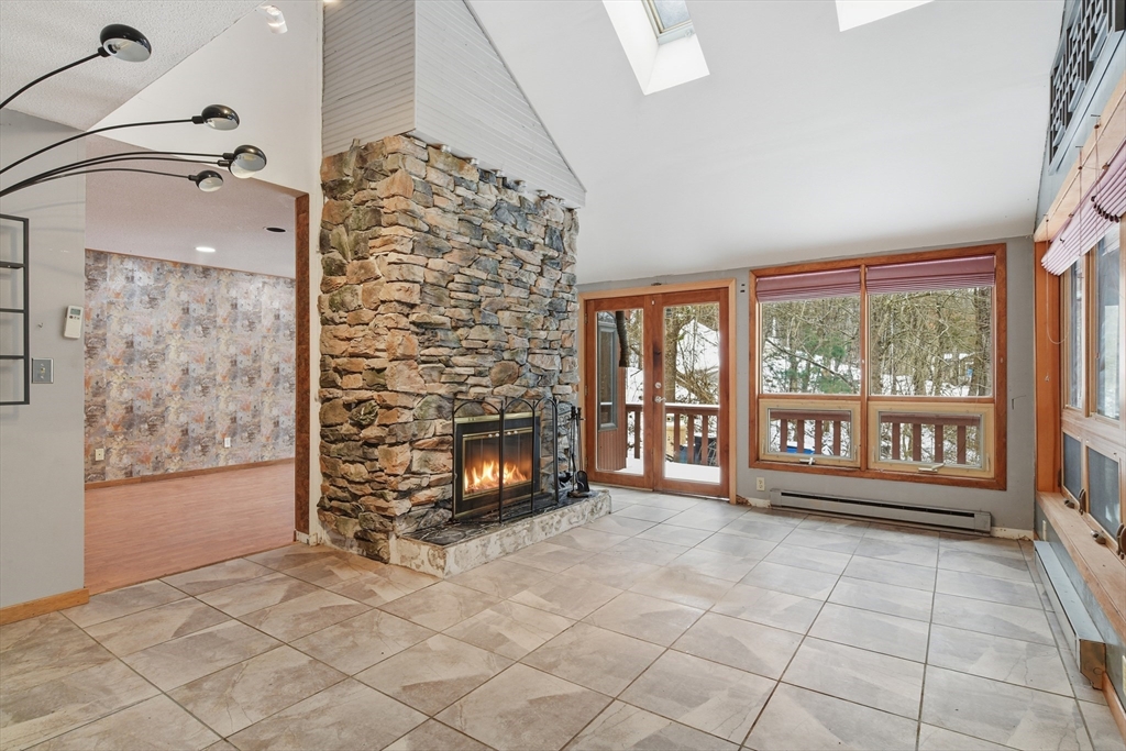 Tucked away in a private riverfront setting, in the Tantasqua school district, this striking contemporary home is a rare nature lover’s retreat set on 12 acres, bordered by wide open fields and peaceful woodland. A metal-roofed gazebo at the river’s edge offers a serene spot to relax and unwind. Inside, soaring ceilings, a dramatic living room fireplace, sunroom, and a spiral staircase create modern architectural appeal. A flexible bonus room offers potential for a first-floor bedroom. The sleek, contemporary kitchen opens to the main living space, ideal for entertaining. The primary suite features its own fireplace, and mini-splits provide efficient heating and cooling. The finished lower level includes open living space, a 6-person hot tub, and walk-out access to a large deck overlooking the private wood-line. With a few finishing touches, this property offers exceptional potential to become a one-of-a-kind riverfront sanctuary blending privacy, modern design, and natural beauty.