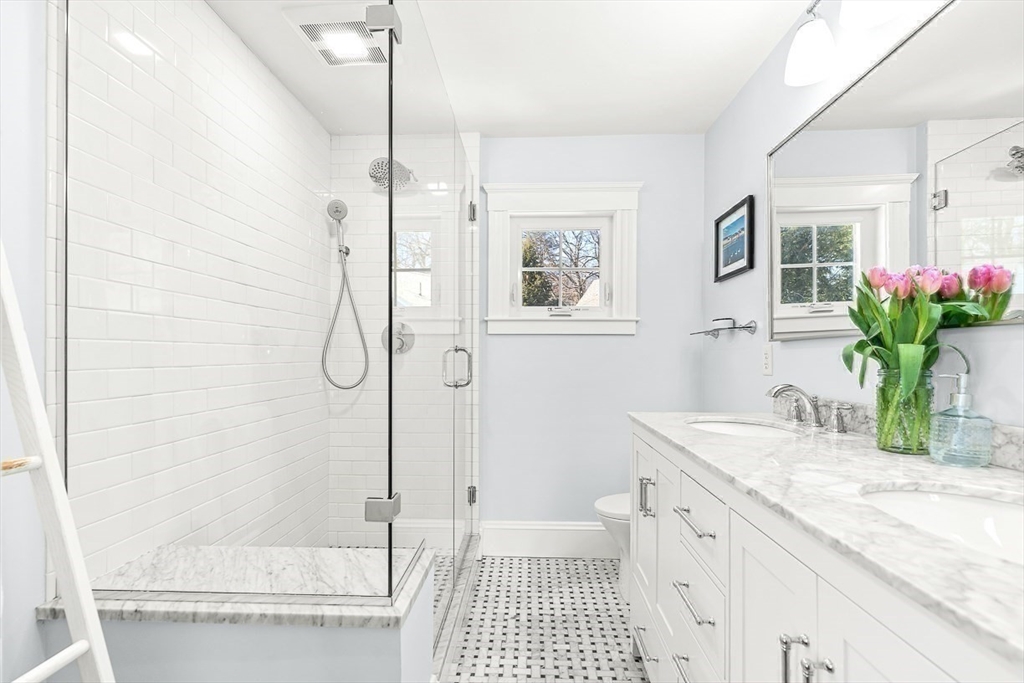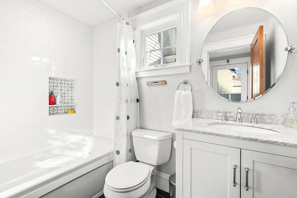 Welcome to this beautifully renovated 1930s Colonial where timeless charm meets modern upgrades in one of Melrose's most sought after neighborhoods. Impeccably maintained and decorator perfect, this home offers quality craftsmanship, modern systems, and a functional floor plan not far from the Horace Mann School,town amenities and public transit. The main level features a remodeled kitchen with quartzite counters and stainless steel appliances flowing into inviting living room and dining spaces ideal for everyday living and entertaining and a new mudroom and full bath.Upstairs are three bedrooms and an updated bath with walk-in glass shower and double vanity. Refinished hardwood floors throughout.System upgrades include a new 30 yr roof, double paned windows, 200 Amp electrical service, new water heater, high efficiency gas heat and AC with 2 zones,Nest thermostats, solar panels and EV charger. Private backyard retreat with paver patio, detached garage and off street parking.