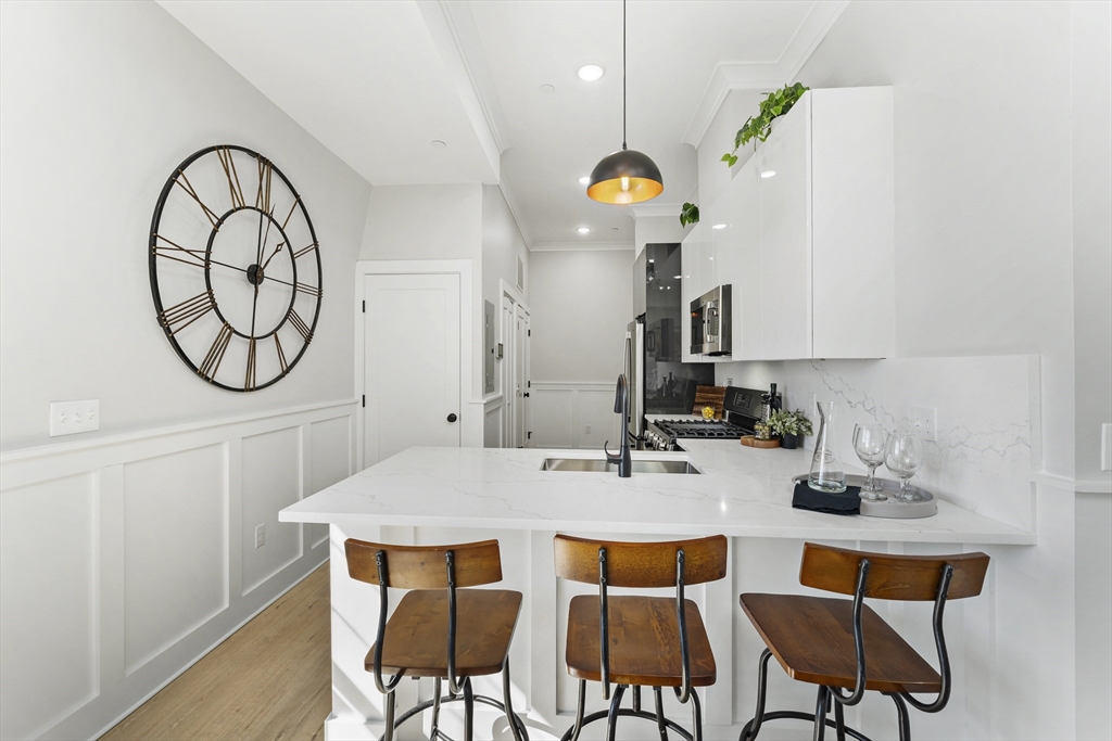 FANTASTIC NEW CONSTRUCTION WITH HUGE EXCLUSIVE USE ROOF DECK AND STUNNING PANORAMIC VIEWS OF BOSTON. GREAT FINANCING... 5.625% on a 10/6 (fixed for 10 yrs @ 5.625% , turns into a 6 month adjustable) - No Points... Less than a half to the Green Line!... Also includes RARE EXCLUSIVE GARAGE PARKING SPOT. Fantastic quality, incredible value... Stunning Sun Splashed Luxurious top flr unit w/ 9 ft clngs, skylight & custom paneled walls. Wide plank dirty blond flrs. Kitchen has new stainless appliances with quartz brkfst islnd. Fantastic Primary Bedroom with double sliders to a faux balcony, BIG gorgeous double basin luxury bathroom and great closet space. In Unit Laundry. Full EXCLUSIVE FULL WALK UP to a huge 19 ft awesome roof deck with breathtaking Boston and hillside views. Beautiful common areas with big brick rear patio and bike rack. GREAT Winter Hill location. Walker's Paradise Walk Score of 90.