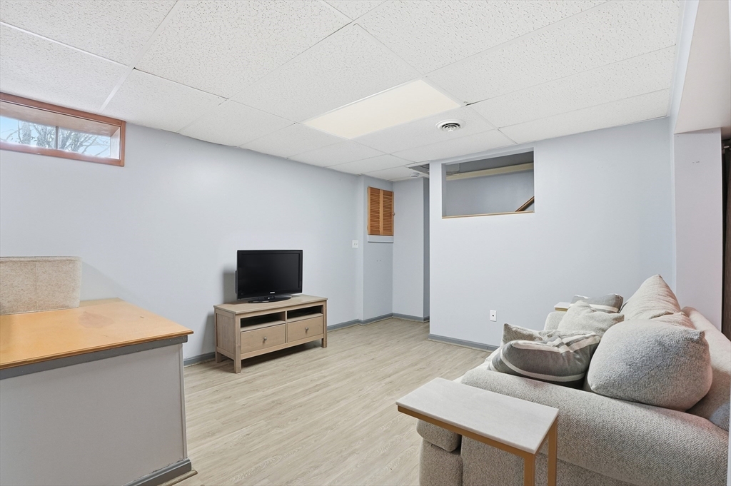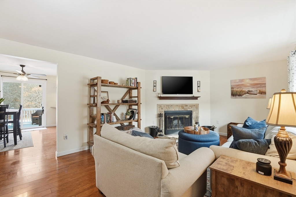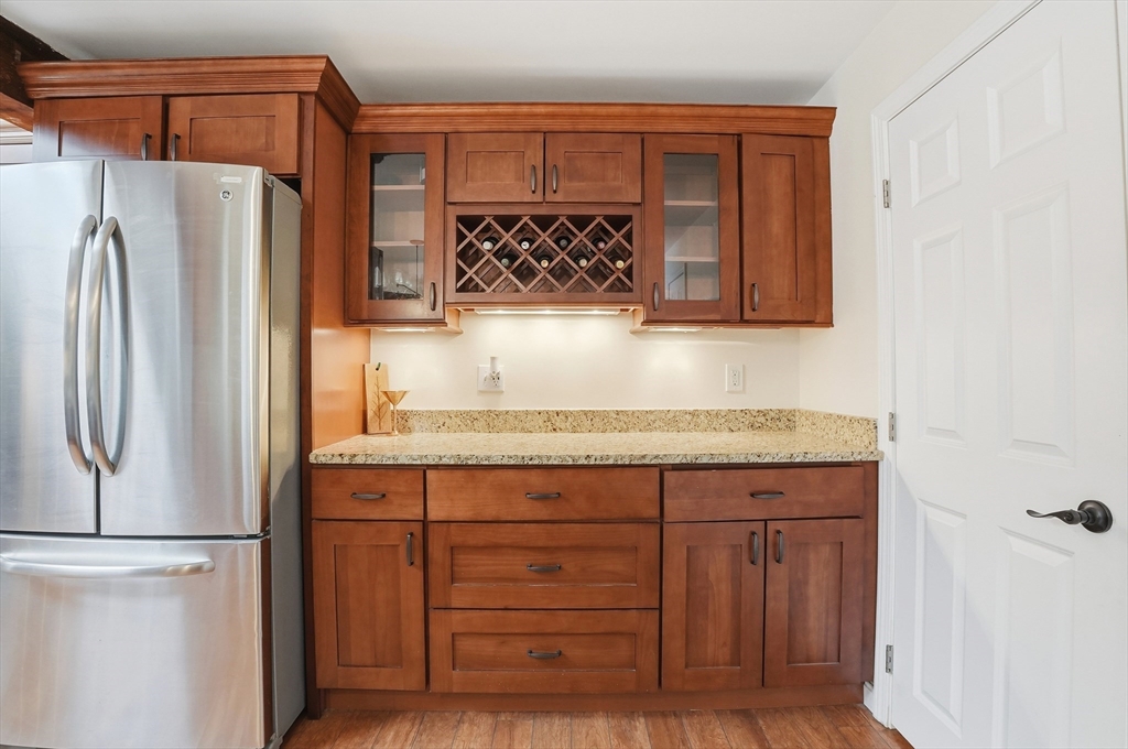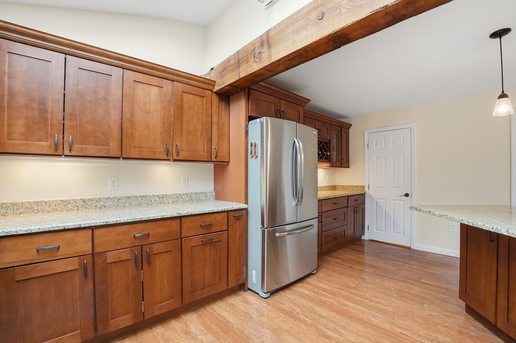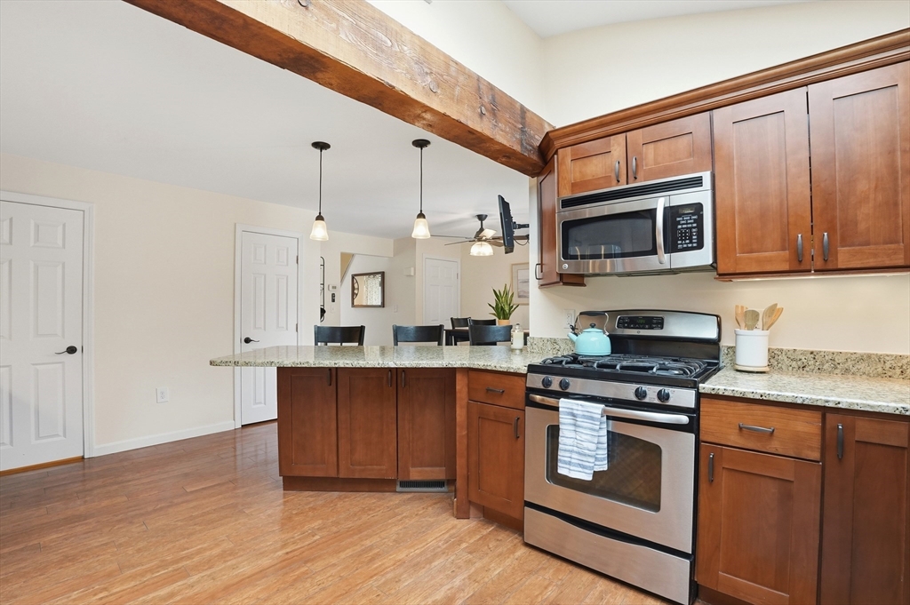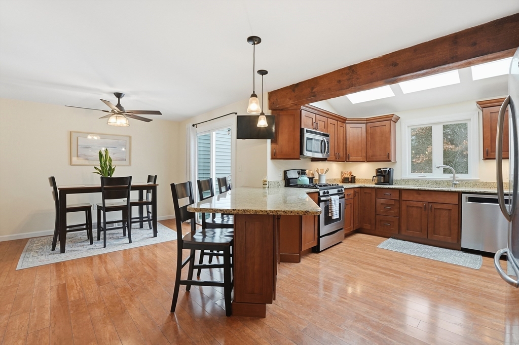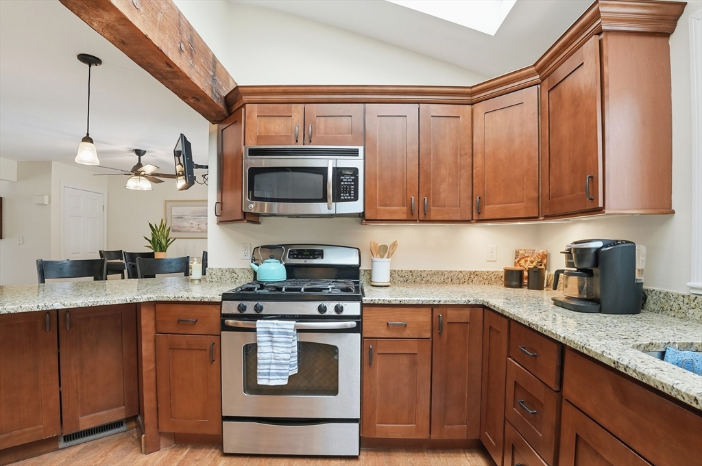 Welcome home to this 2 bedroom townhouse offering the perfect blend of warmth and modern updates. Step inside to a sun-filled living room with gleaming floors and a cozy wood-burning fireplace. The open-concept kitchen and dining area is ideal for everyday living and entertaining, featuring granite countertops, stainless steel appliances, peninsula seating for three, skylights, exposed wood beams & a pantry. A slider leads to the back deck and spacious shared yard. Upstairs, you'll find a large primary bedroom with two closets and direct full bath access. A second generously sized bedroom completes this floor. The finished basement provides flexible living space with built-ins, recessed lighting, a game area, laundry + storage, and bulkhead access. Major updates: (2025) vinyl siding, upstairs windows, front steps & bulkhead (2024) new roof. Easy Highway access and close proximity to the Xfinity Center & Wheaton College.