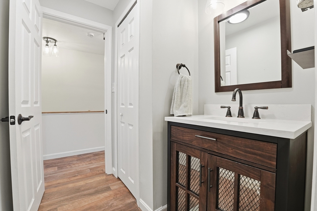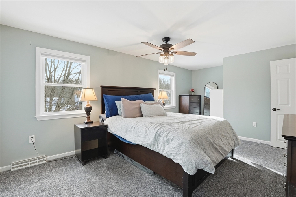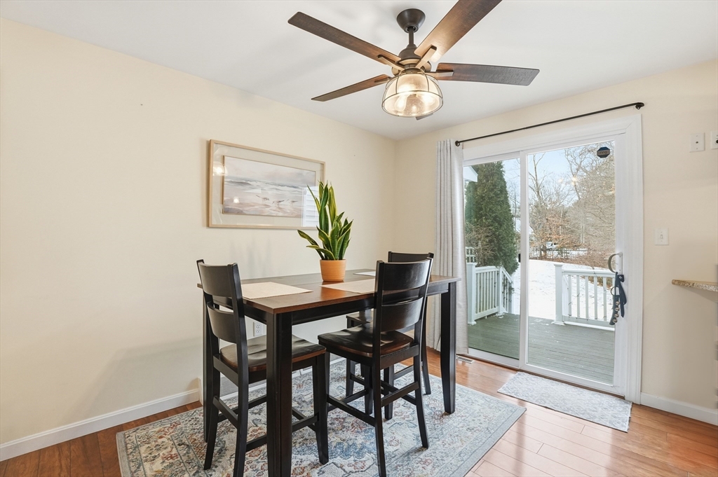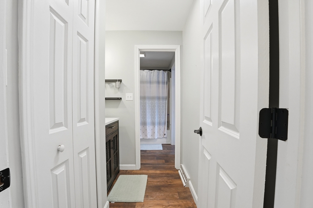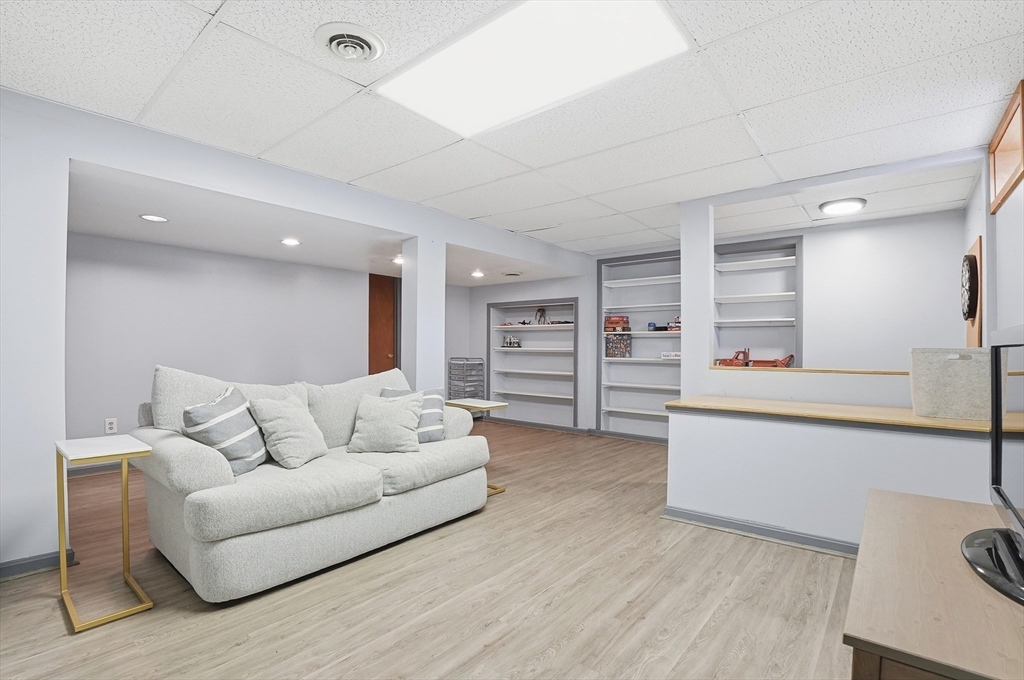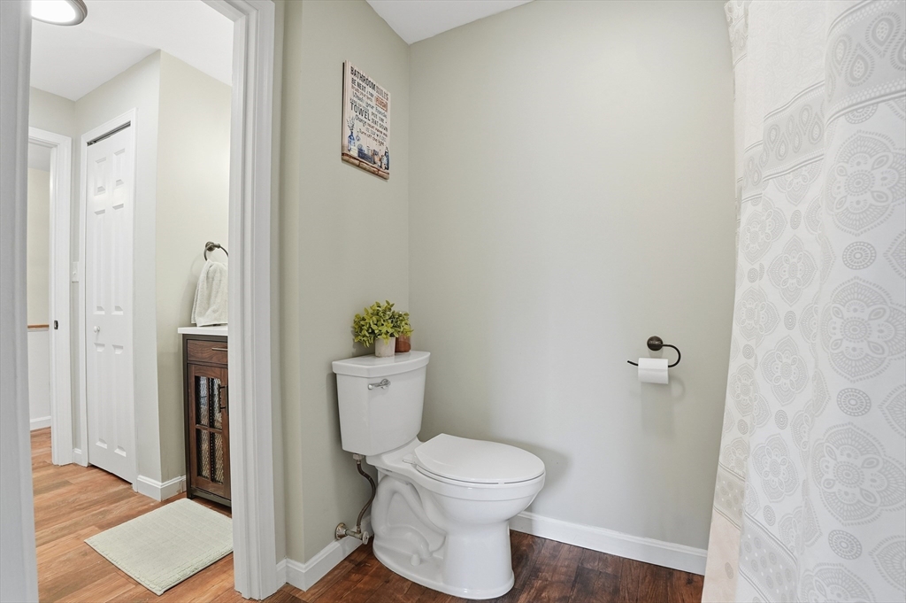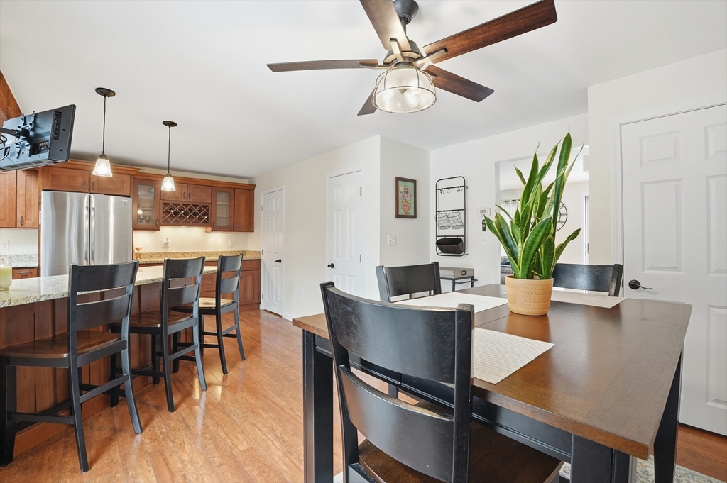 Welcome home to this 2 bedroom townhouse offering the perfect blend of warmth and modern updates. Step inside to a sun-filled living room with gleaming floors and a cozy wood-burning fireplace. The open-concept kitchen and dining area is ideal for everyday living and entertaining, featuring granite countertops, stainless steel appliances, peninsula seating for three, skylights, exposed wood beams & a pantry. A slider leads to the back deck and spacious shared yard. Upstairs, you'll find a large primary bedroom with two closets and direct full bath access. A second generously sized bedroom completes this floor. The finished basement provides flexible living space with built-ins, recessed lighting, a game area, laundry + storage, and bulkhead access. Major updates: (2025) vinyl siding, upstairs windows, front steps & bulkhead (2024) new roof. Easy Highway access and close proximity to the Xfinity Center & Wheaton College.