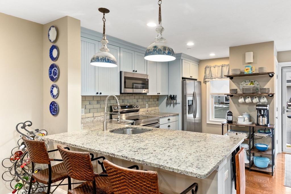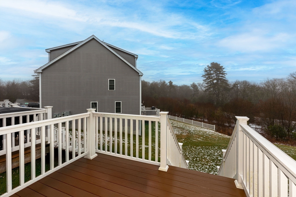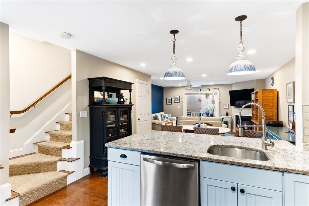 Welcome to Nemasket River Landing and this beautifully designed 3-bedroom, 2.5-bath townhouse offering space, comfort, and convenient access to the commuter rail. The first floor features an open-concept layout with a well-appointed kitchen and dining area accented by hardwood floors. The living room boasts a cozy gas fireplace and sliders leading to a deck overlooking peaceful conservation land. The second floor offers a spacious primary suite with a full ensuite bath, an impressively oversized walk-in closet, and the convenience of an in-unit washer and dryer. The third floor includes two additional bedrooms and a full bath, ideal for guests, a home office, or flex space. The unfinished walkout basement features high ceilings, providing excellent potential for future finished living space or generous storage. Additional features include an interior sprinkler system for added safety and peace of mind. Enjoy low-maintenance living in a private, tranquil setting—this home has it all.
