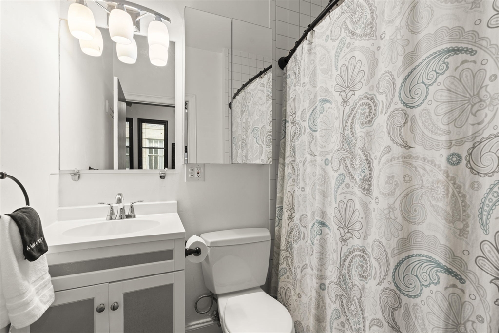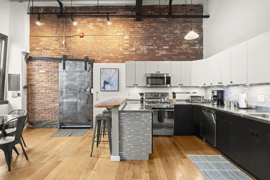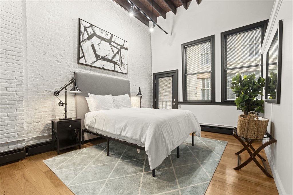 1 Bed, 1 Bath loft space with future roof deck potent!al One-of-a-kind open, airy penthouse loft space with dramatic flair and southern light. This unique home features 11+ foot ceilings with original wooden beams, exposed brick and antique factory style hardwood flooring. Currently configured as a one bedroom space the home has a custom bookshelf to designate your sleeping area.The open kitchen has industrial style painted cabinetry and an open peninsula perfect for entertaining. In-unit washer and dryer and white tile bath with tub. A true commercial loft feel in the heart of residential Back Bay. This home comes with private roof rights to create an incredible outdoor space! Brand new commercial roof is ready to go and full stair to the roof is already in place. Incredible location within moments to the Back Bay T station with Flour Bakery and Friendly Toast on the block. Ask agent about the new 5 star hotel and greenway slated for Stanhope Street! Pet friendly. Rentals 28 day min.
