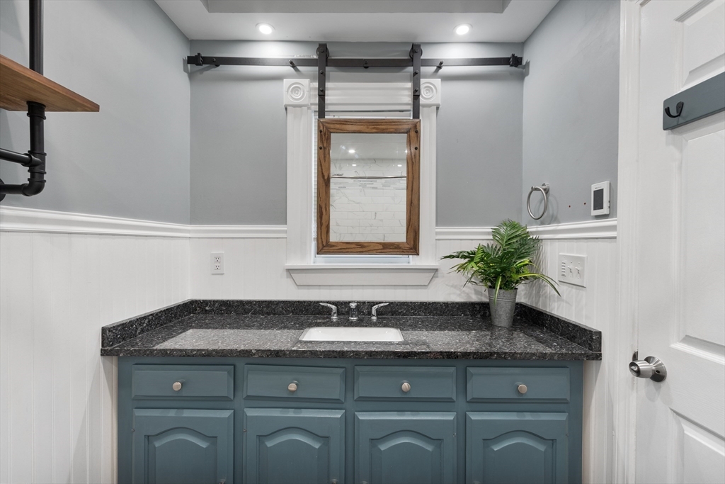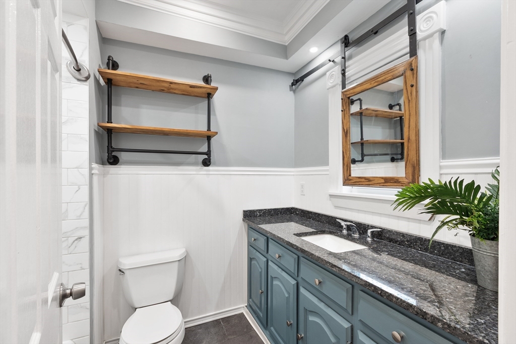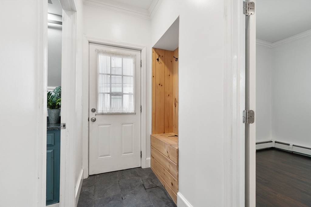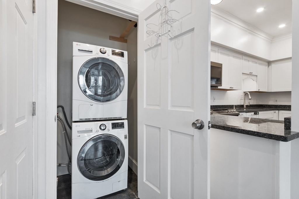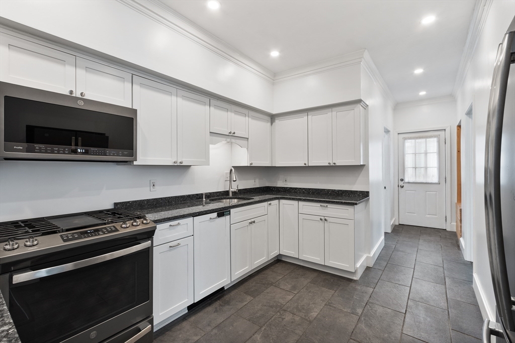 Beautifully appointed first floor end-unit condo with private entrance offers luxury living with modern amenities with classic charm and details. The beautifully updated kitchen has desirable finishes including granite counters and recessed lighting. The bath showcases quality finishes and thoughtful detail including radiant heated floors and granite counters, creating a stylish and functional space. Enjoy the inviting fireplaced living room with coffered ceilings, generous sized bedrooms, in-unit laundry, newer windows, and a newer efficient heating system. A rare bonus, this home includes a large separate large storage area and two deeded parking spaces. Ideally located just minutes to downtown, major highways, and the commuter rail, this home delivers the perfect blend of elegance, convenience, and low-maintenance living. This association has a new roof. Multiple offers. All offers due Sunday 1/11 by noon.