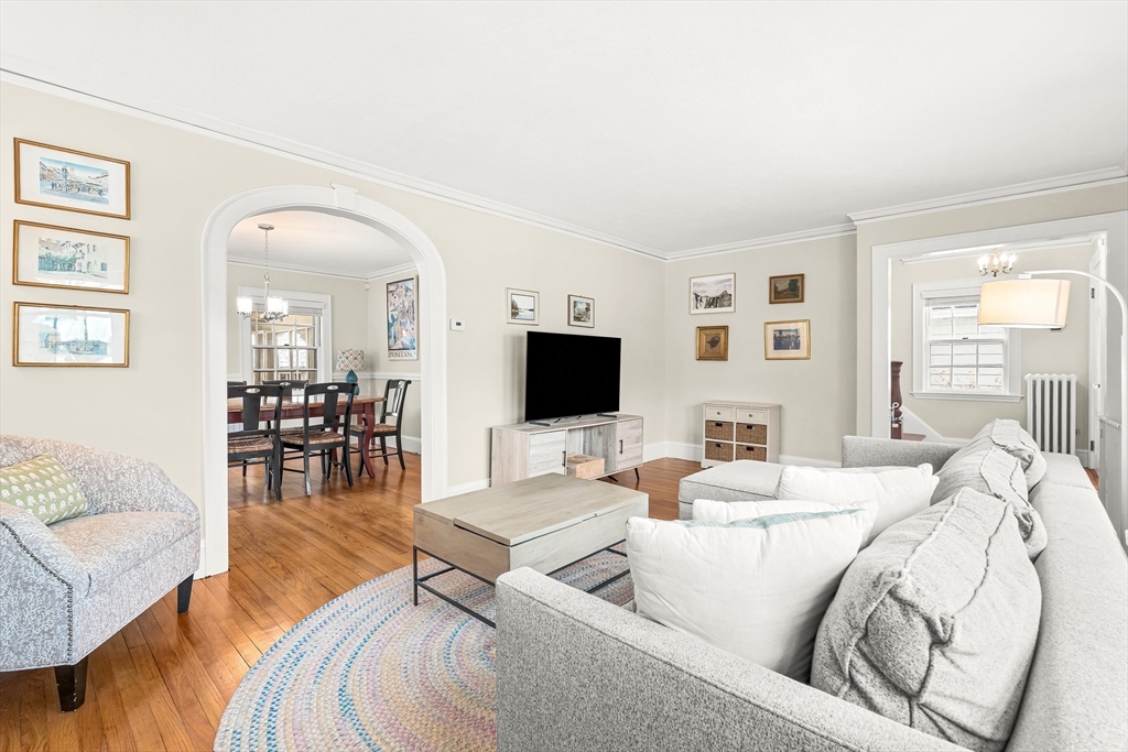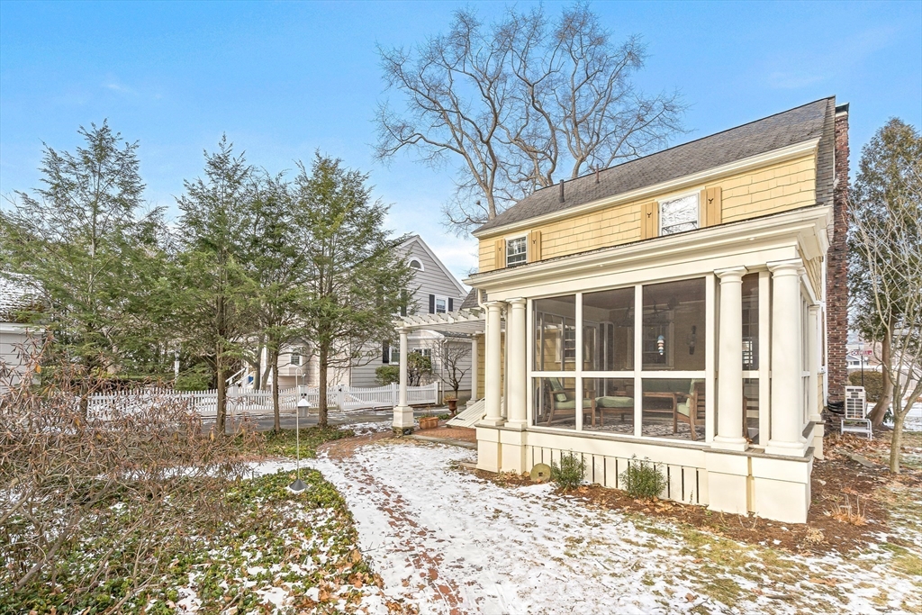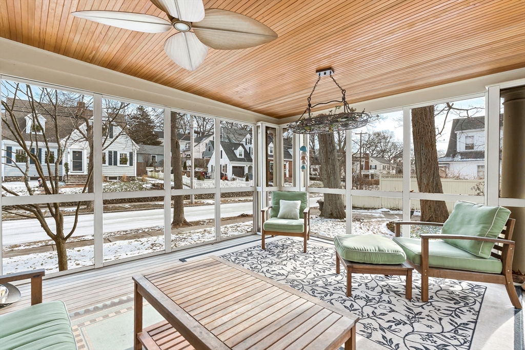 Quintessential Horace Mann English Colonial set on a corner lot blends timeless craftsmanship, irresistible charm, and sought-after updates. This beautifully maintained home features classic millwork, hardwood floors, and a fireplaced living room that opens to an elegant dining room with built-ins. Beautifully renovated kitchen offers quartz countertops, stainless steel appliances, and a sunlit dining area. Enviable screened porch with Ipe flooring and architectural columns creates a relaxing three-season retreat overlooking landscaped grounds—ideal for entertaining. Upstairs there are three well-proportioned bedrooms with ample closet space and a walk-up attic. A finished basement provides flexible space for work or leisure. Recent upgrades include mini-split cooling and heating for year-round comfort, new boiler (2023), and 200-amp electrical service. Lovell Rd. offers a rare blend of serene living with close proximity to schools, public transportation, restaurants, and shops.