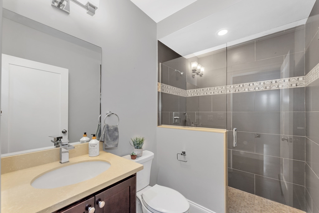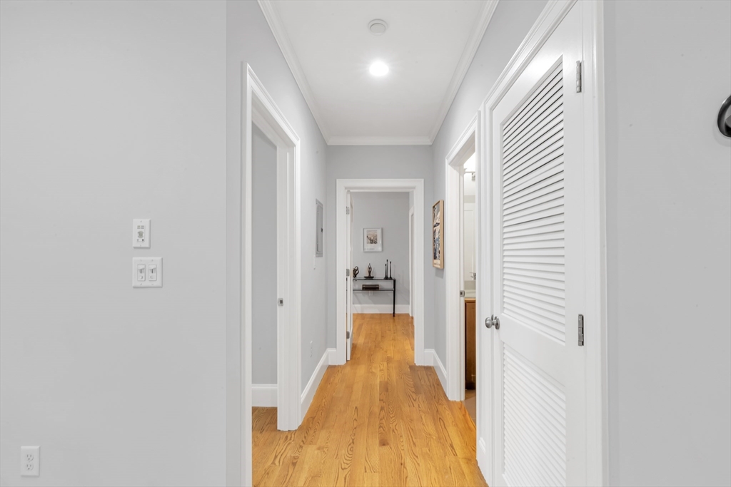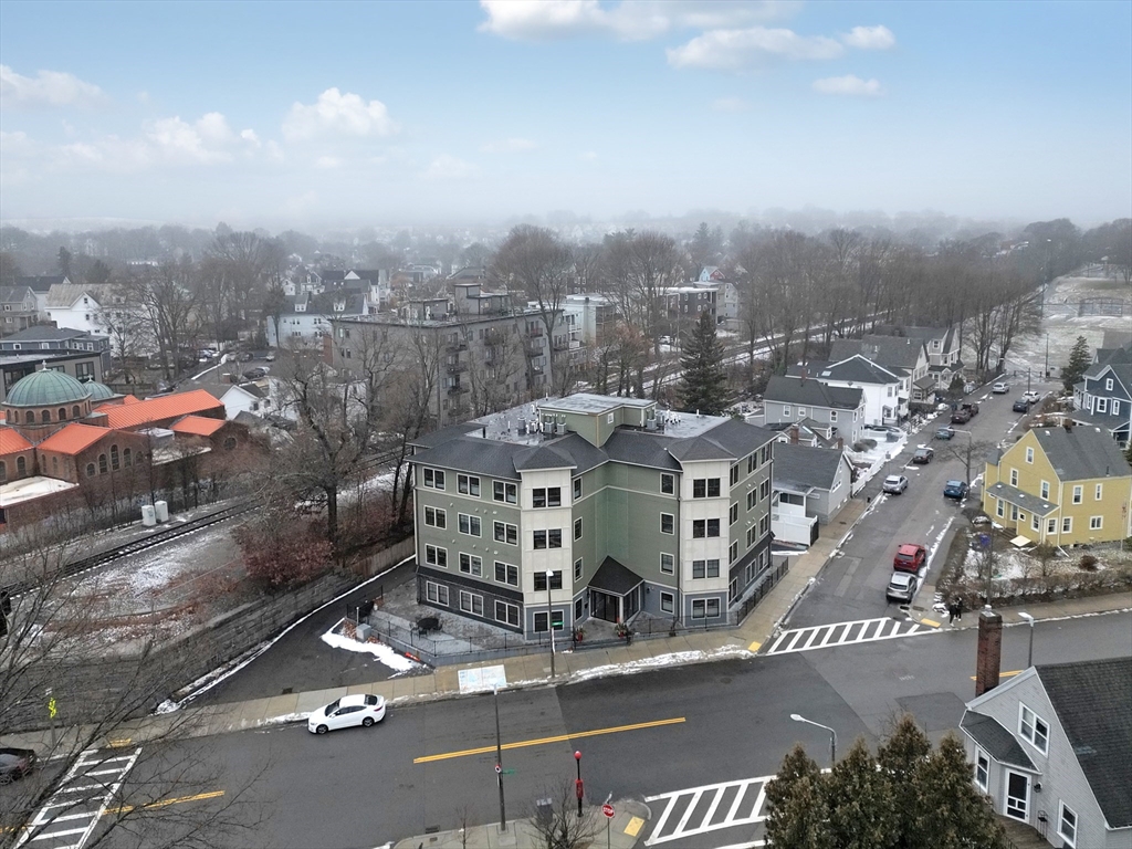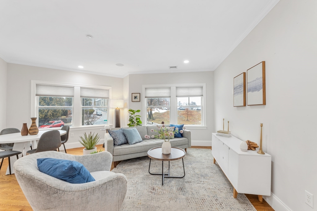 Live at the center of Roslindale Village in this sun-drenched 2-bed, 2-bath residence, where dramatic walls of windows frame the neighborhood energy and flood the home with light. Set in a boutique, professionally managed elevator building just 10 years young, this modern layout is refined with recessed lighting, crisp moldings, and elevated finishes throughout. The chef-inspired kitchen impresses with quartz counters, stainless appliances, designer tile backsplash, and generous bar seating—perfect for entertaining. Both baths feel spa-like with glass-enclosed tile showers (one en suite, one walk-in). The primary suite offers a walk-in closet; the second bedroom is spacious and versatile. Enjoy central air, efficient HVAC, built-in Bluetooth speakers, and fresh paint—truly move-in ready. The building is poised to gain value with upcoming capital improvements—and unlike other recent sales, this seller will pay the special assessment prior to closing. Close to great dining options!