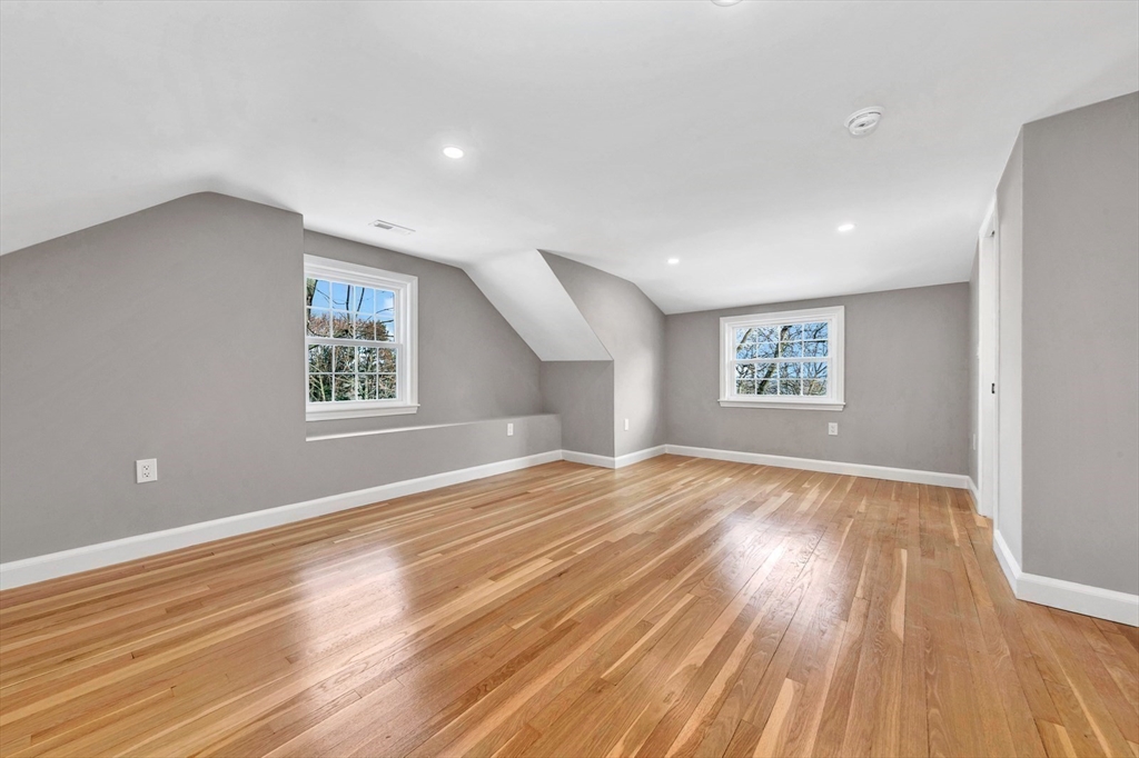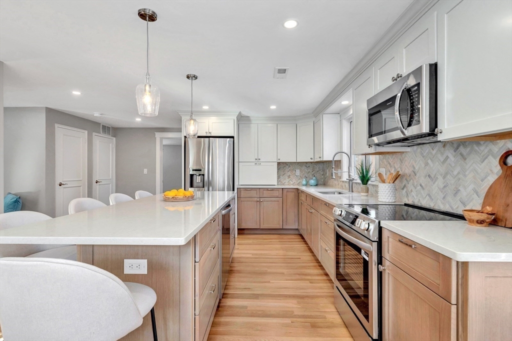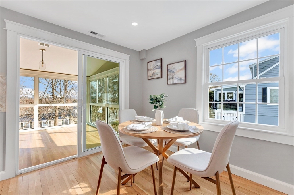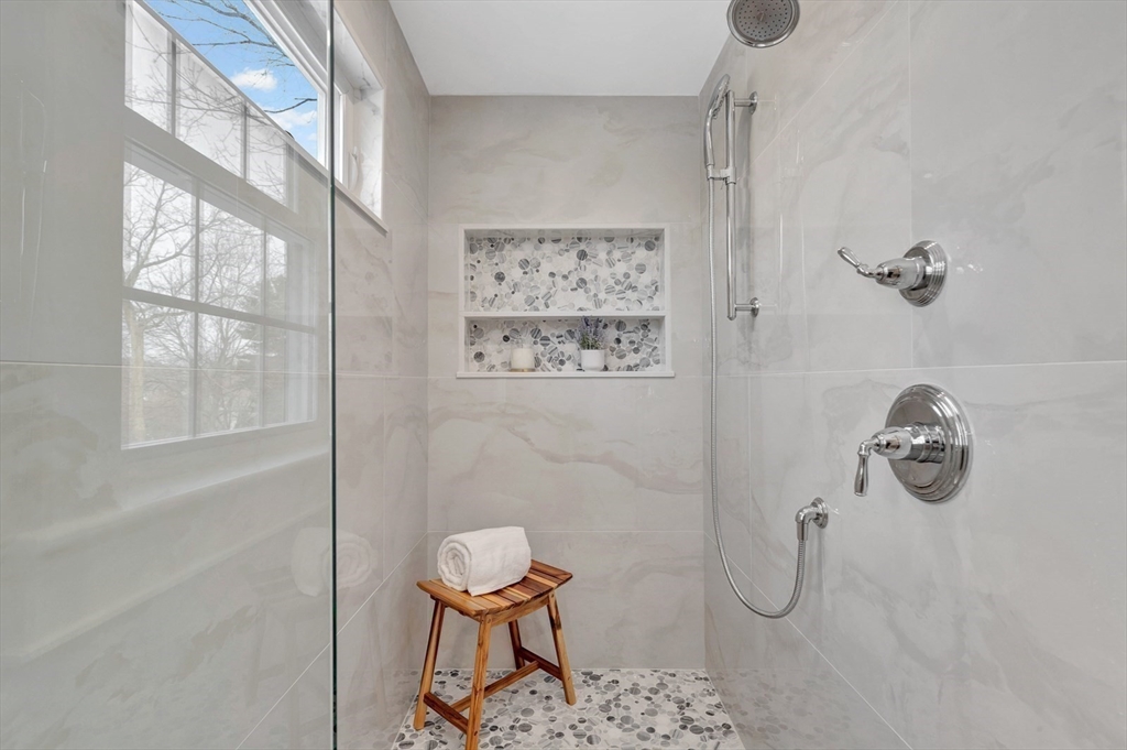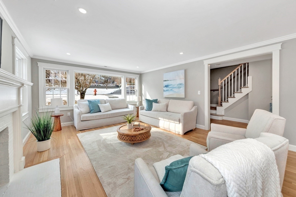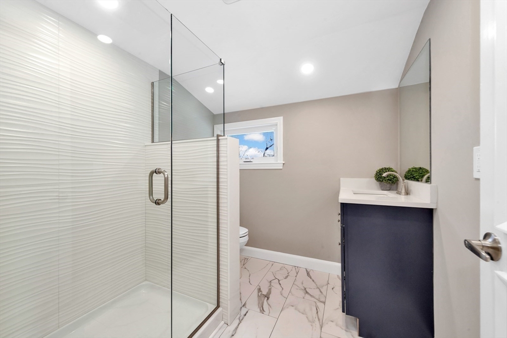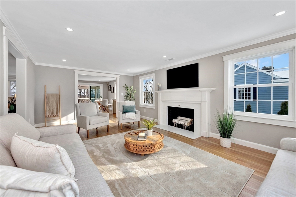 This beautiful, move-in-ready Cape has been thoughtfully renovated from top to bottom. Oversized front walks lead to a charming front porch and into a welcoming foyer that opens to a sun-filled open-concept layout with fire-placed family room, dining area, and kitchen—ideal for everyday living and entertaining. A bright bonus room off the kitchen with wall-to-wall windows and heat/AC offers year-round enjoyment. The first-floor primary suite features hardwood floors, double closets, and a spa-like bath with double vanity and glass-enclosed tiled shower. The second floor features two front-to-back bedrooms, each with a private tiled bath. The finished lower level provides direct access to the 2-car garage, mudroom and flexible space—perfect for a home gym, office, media room, hang-out area or if wanted, a potential ADU with some vision. A stunning home offering comfort, style, and versatility. Open House Sat & Sun 11:30–1.