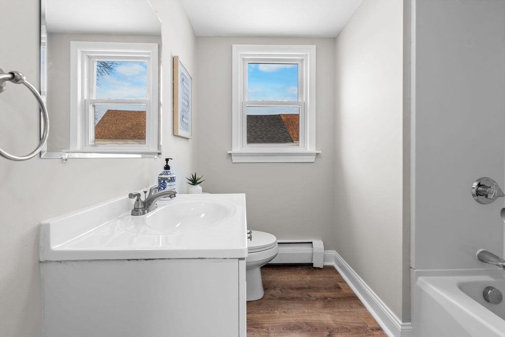Welcome to this charming three bedroom home set on a corner lot, offering a functional layout and a fully fenced yard with garage parking. Built in 1950, the home features two bedrooms upstairs and a primary bedroom on the main level, creating flexible living options. Refinished hardwood floors run throughout much of the home, complemented by vinyl flooring in the kitchen and bathroom. Fresh interior paint adds to the bright, welcoming feel. The kitchen includes shaker cabinets, granite countertops, and updated appliances. In addition to ample storage, the basement provides almost 400 square feet of partially finished space suitable for a home office, playroom, or additional living area. The solar panels are owned, offering added efficiency. A great option for buyers seeking a move-in-ready home with outdoor space and everyday functionality.