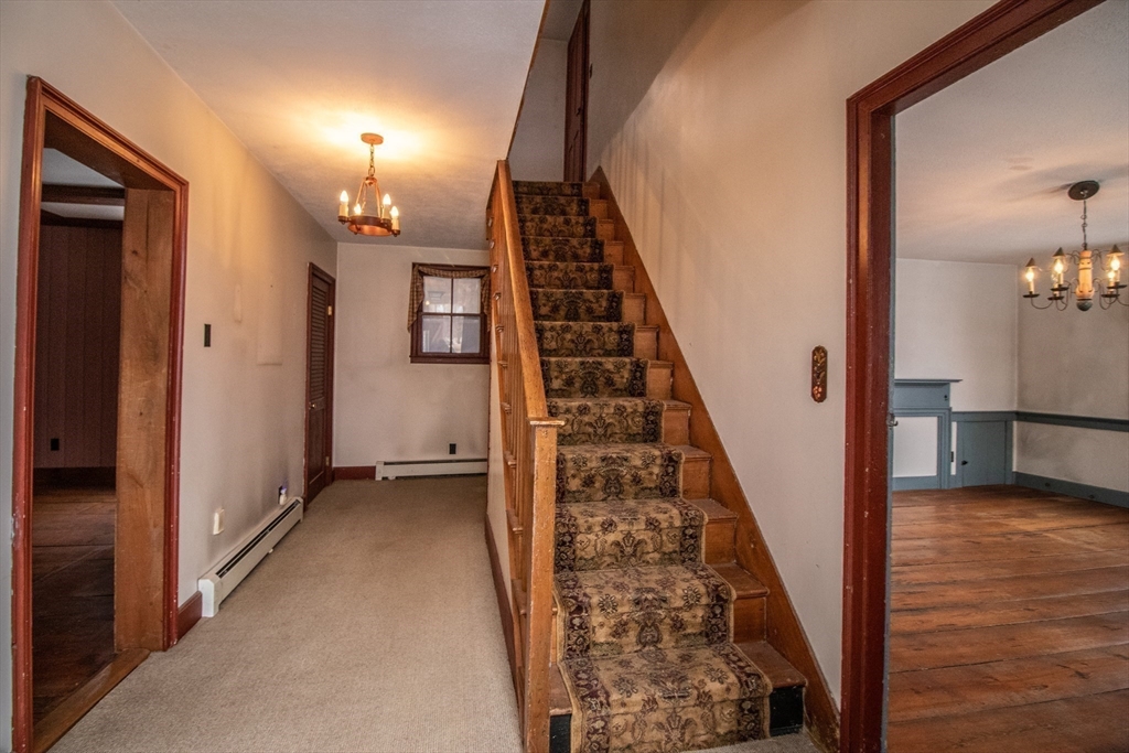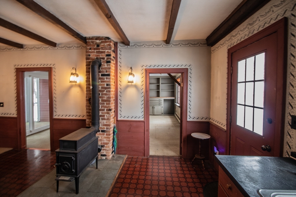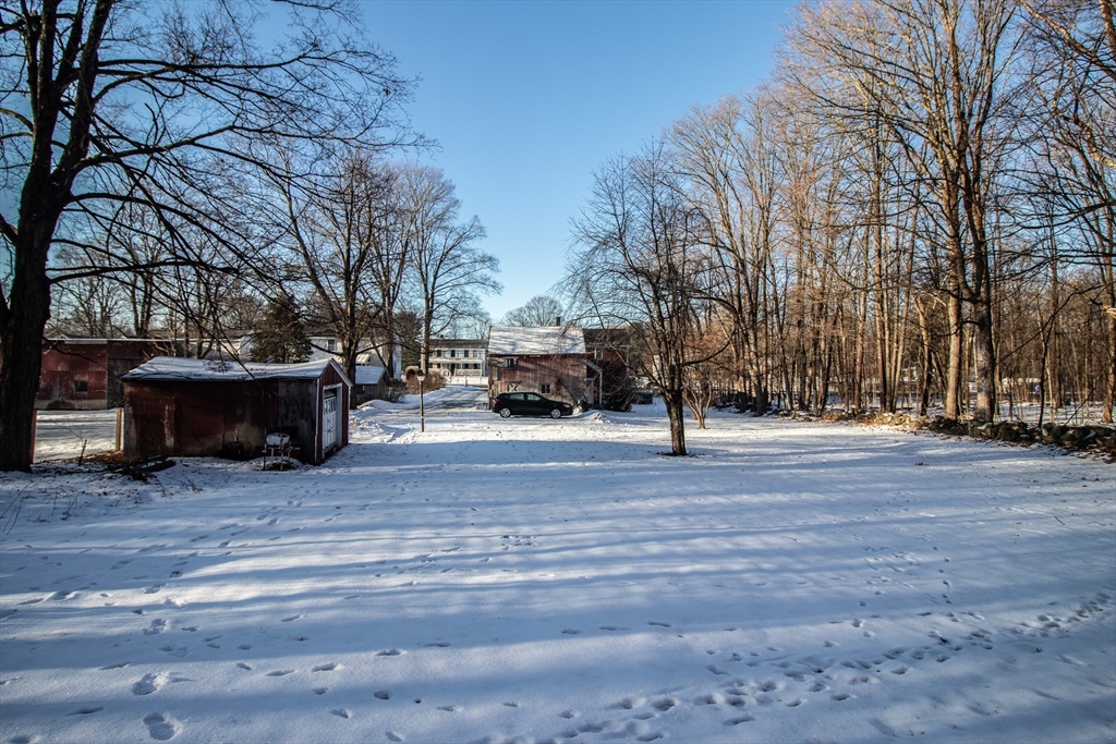 Watch the video! This historic home is tied to Belchertown's 19th century carriage industry. Known as the Park Holland House, its first owner was an owner of the Belchertown Carriage Manufactory. This section of town was also where first carriage making shops were located, thereby making the site the first commercial center in town. This Federal Style home has the typical features of the period, like 12 over 12 double-hung windows, a front entry is framed by a tuscan pilasters and a transom, period colors, and wide-plank floors. The home has 3 bedrooms and two bathrooms, with an attached two-car garage and barn attached to the rear of the house. The parlor room has been painted with a period color and has a coffered ceiling. The dine-in country kitchen has a wood stove, exposed beams, and ample cabinet and counter space. Off the kitchen is a spacious room with a newer slider to an enclosed porch with a brick floor overlooking a garden area. There is also a spacious backyard