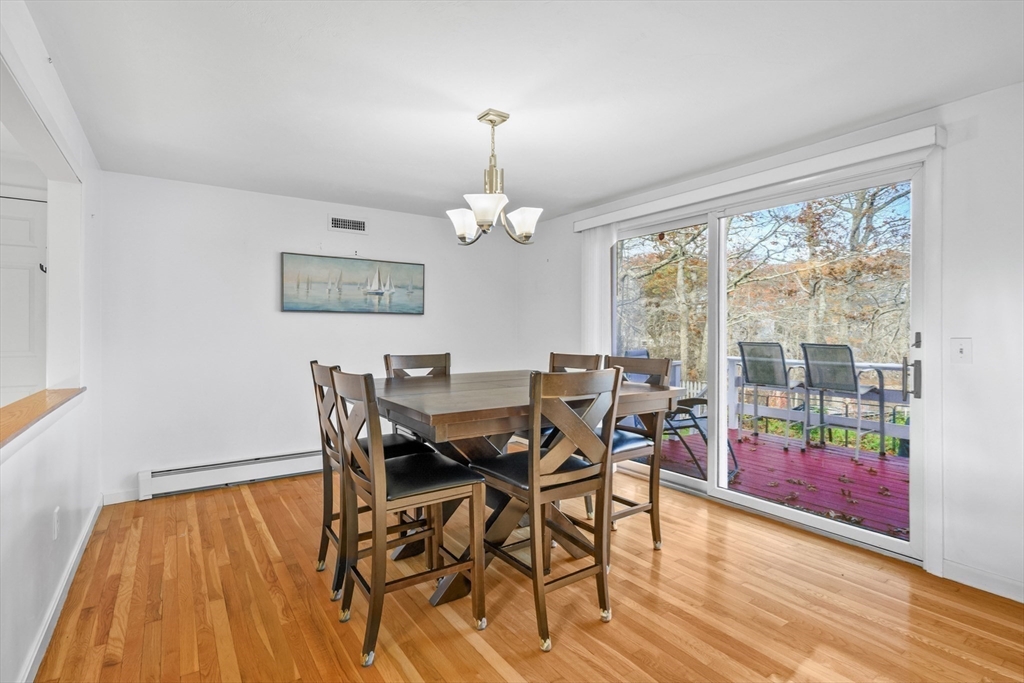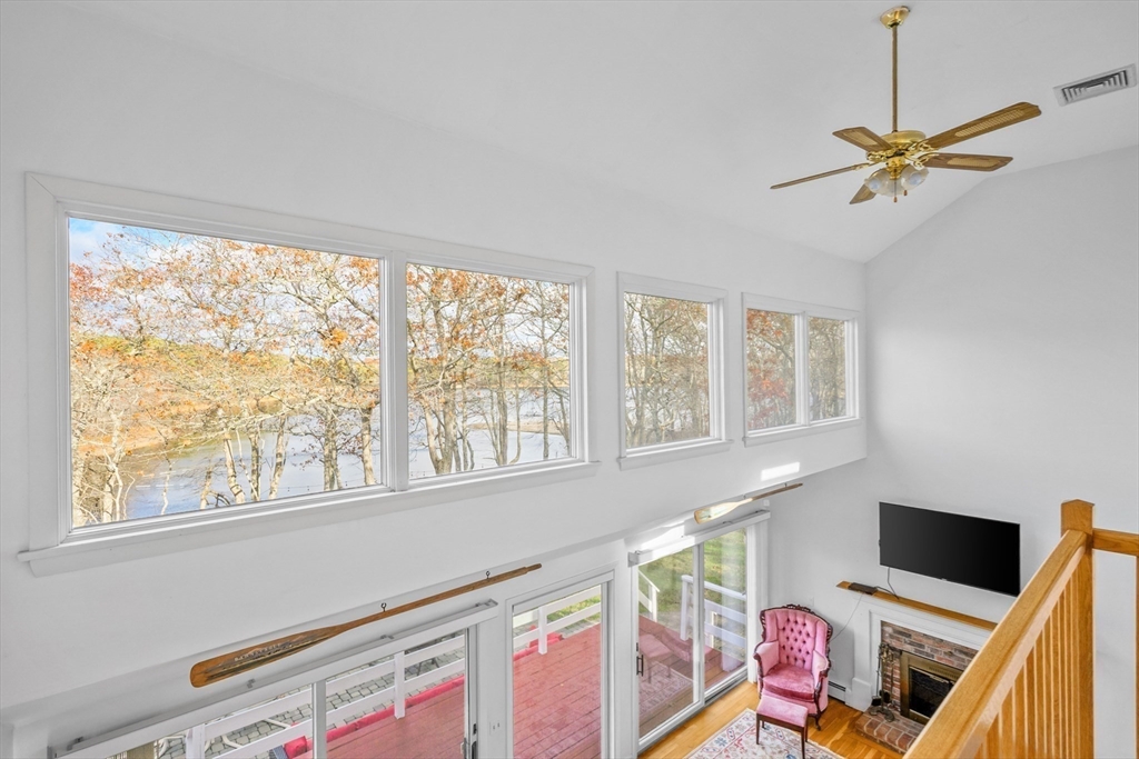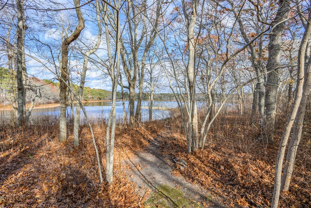 Serene waterfront living with 300 ft of frontage on Big Sandy Pond and a private path for swimming or launching your kayak. Panoramic water views from nearly every room. The 1st floor features an open layout with a bright, beautiful kitchen, a dining room, and a living room with high ceilings and a wood-burning fireplace. A bedroom and full bath complete this level. Upstairs, the expansive primary suite includes a walk-in closet and a balcony to savor sunrises and sunsets over the water. The third bedroom also boasts excellent water views. The finished walkout lower level is designed for entertainment, with a full bar, a half bath, and an additional washer and dryer. Outside, enjoy a large deck and a patio with a built-in fire pit, perfect for gatherings. Additional highlights include a newer roof, a high-efficiency heating system, 2 car garage and central AC. On a cul-de-sac, close to dining, shopping, and ocean beaches.