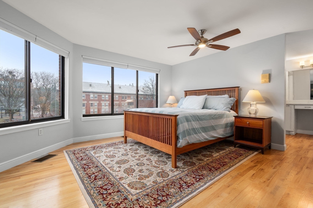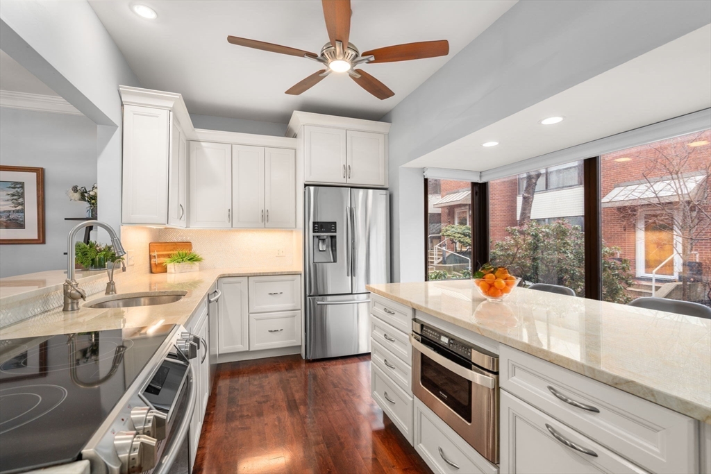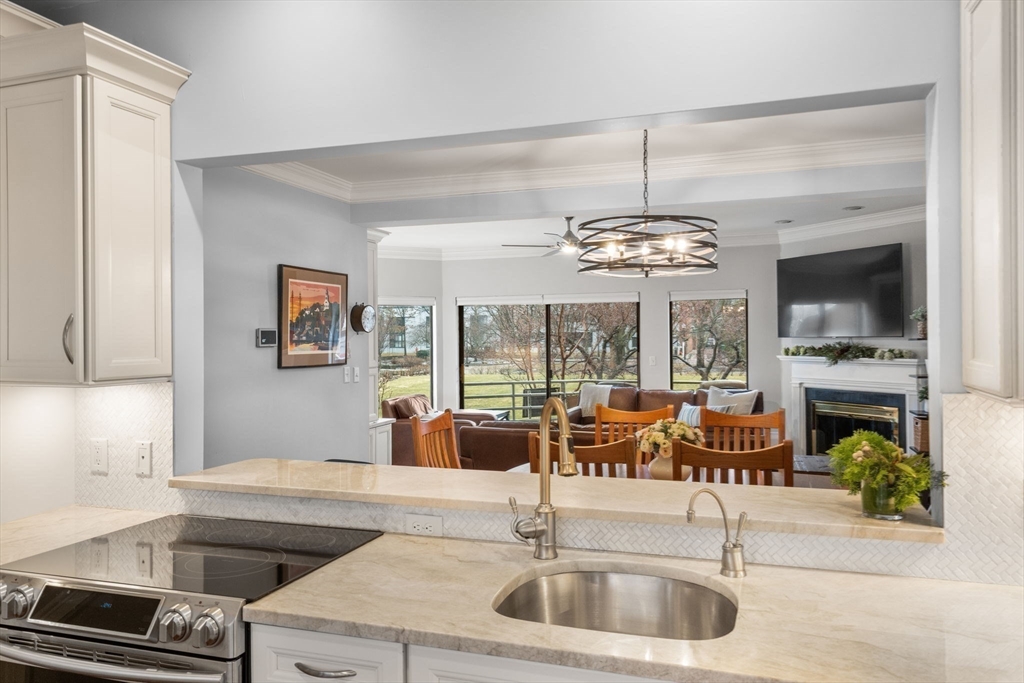 Open Space, Location, and Parking - Sophisticated Waterfront Living in the Historic Navy Yard! This beautiful townhouse offers a bright, and airy floor plan and a water view! The main level is defined with high ceilings, rich cherry hardwood flooring and elegant crown molding. The living room highlights a fireplace, custom built in desk/office cabinetry and bar, & sliding doors leading to private deck w/marina, city & harbor view. The gorgeous kitchen includes a breakfast bar and peninsula with quartzite counters. The second floor primary bedroom with walkin closet and private bath, showcases large windows offering serene views of the marina, city skyline, and harbor. The guest bedroom also has private bath, two closets and floor to ceiling greenhouse window overlooking the courtyard. Two deeded parking spots add to the carefree, convenient lifestyle. This home offers an unrivaled lifestyle of luxury and convenience in Boston’s most historic maritime enclave.
